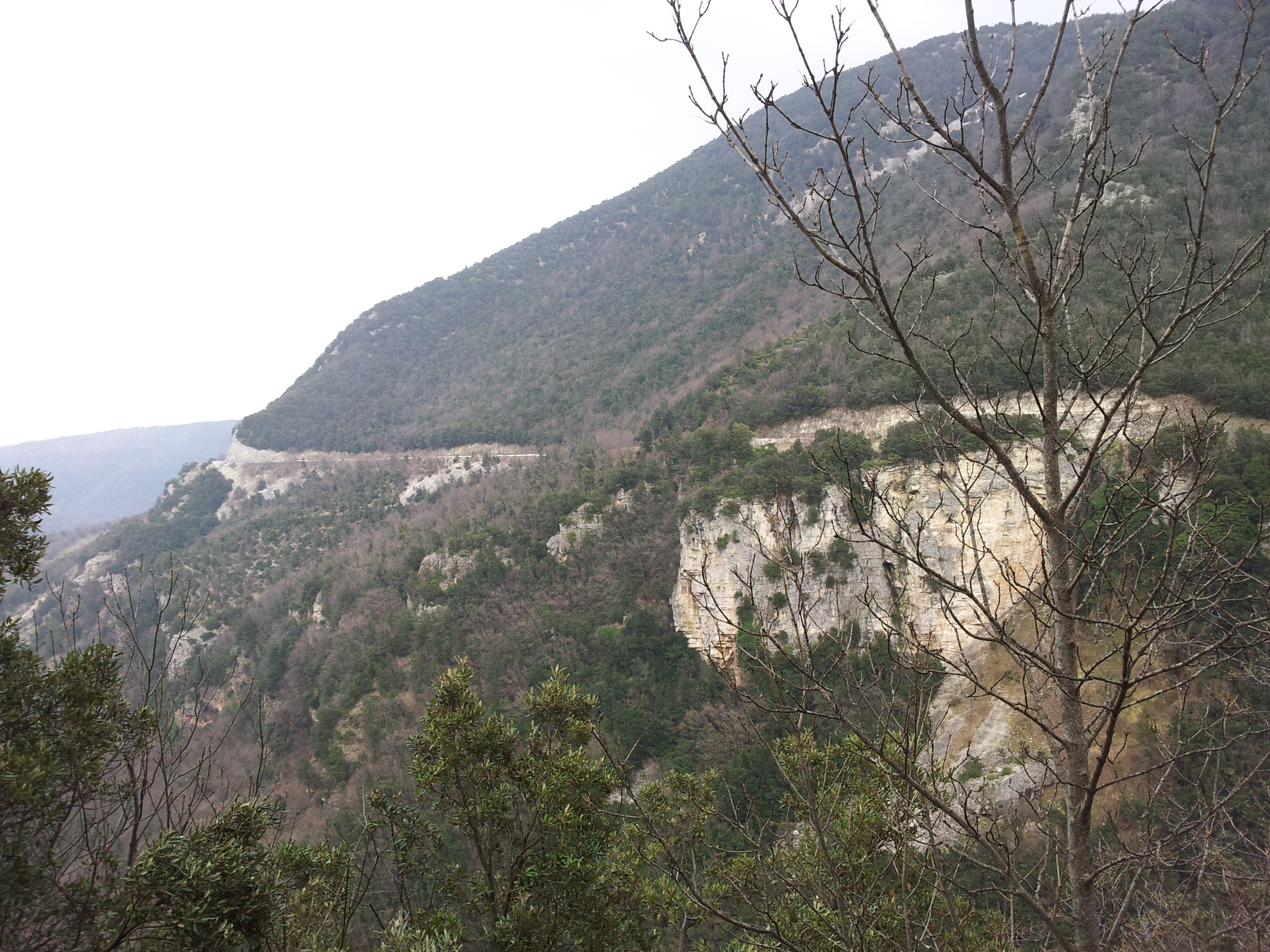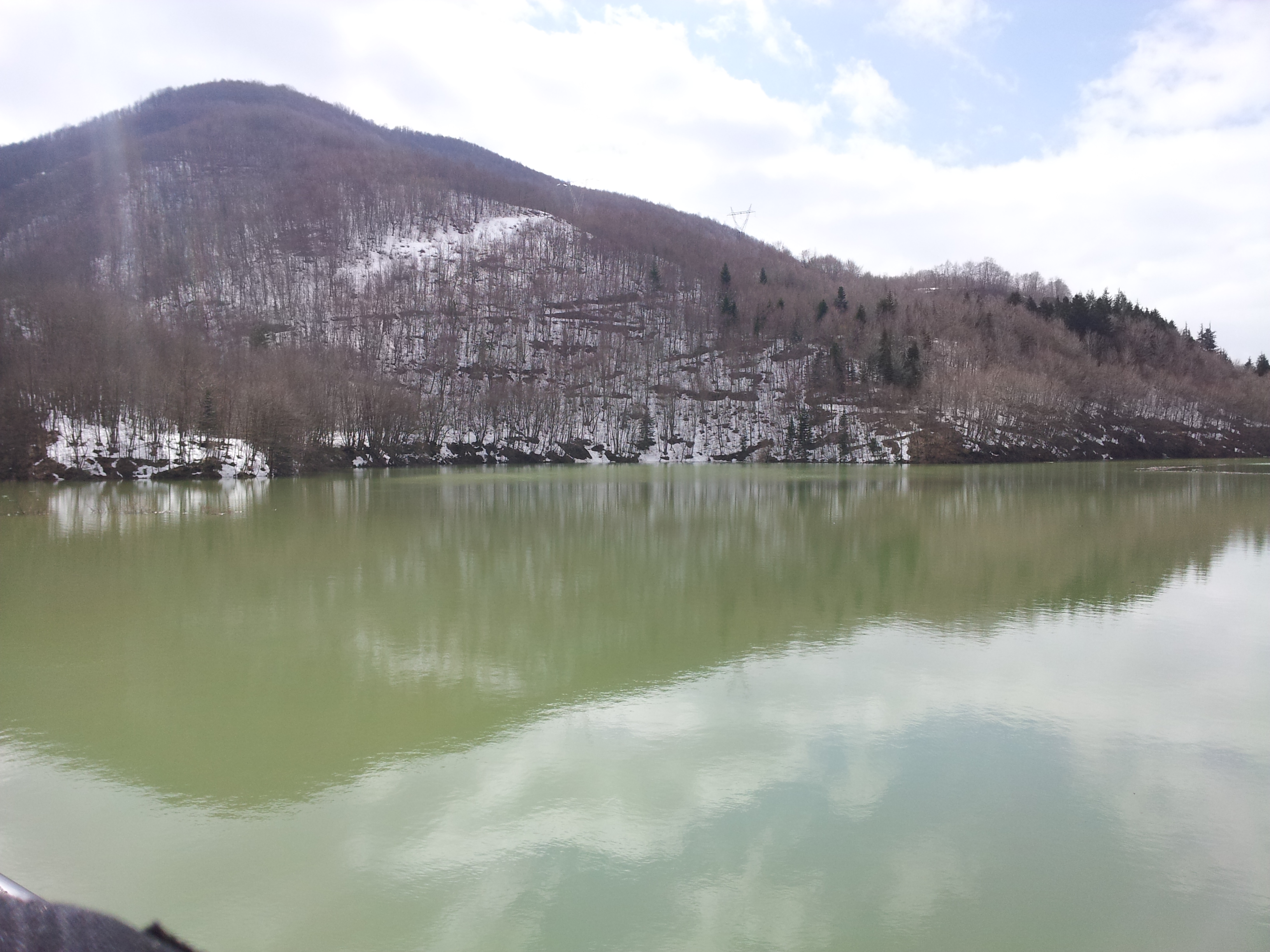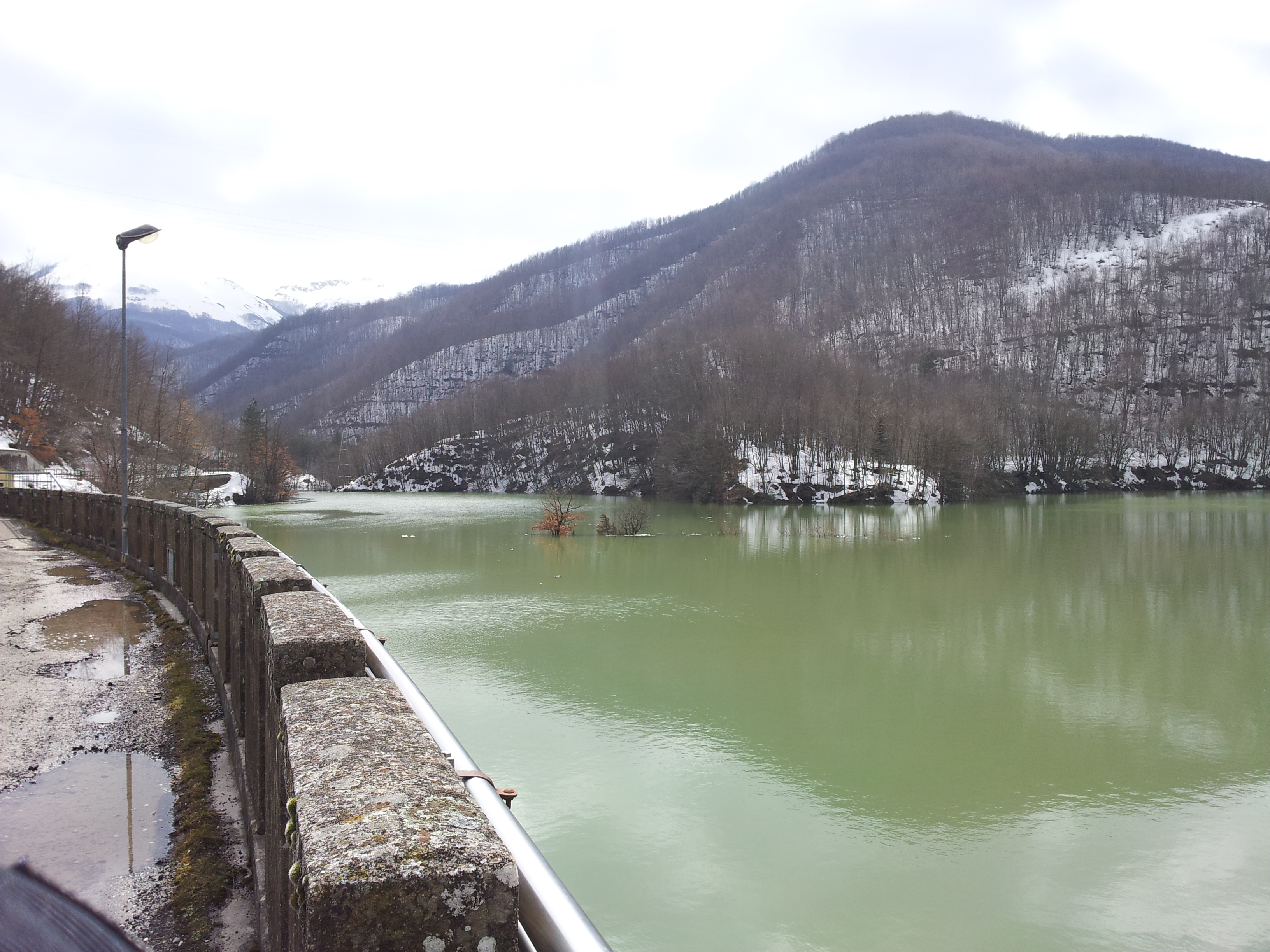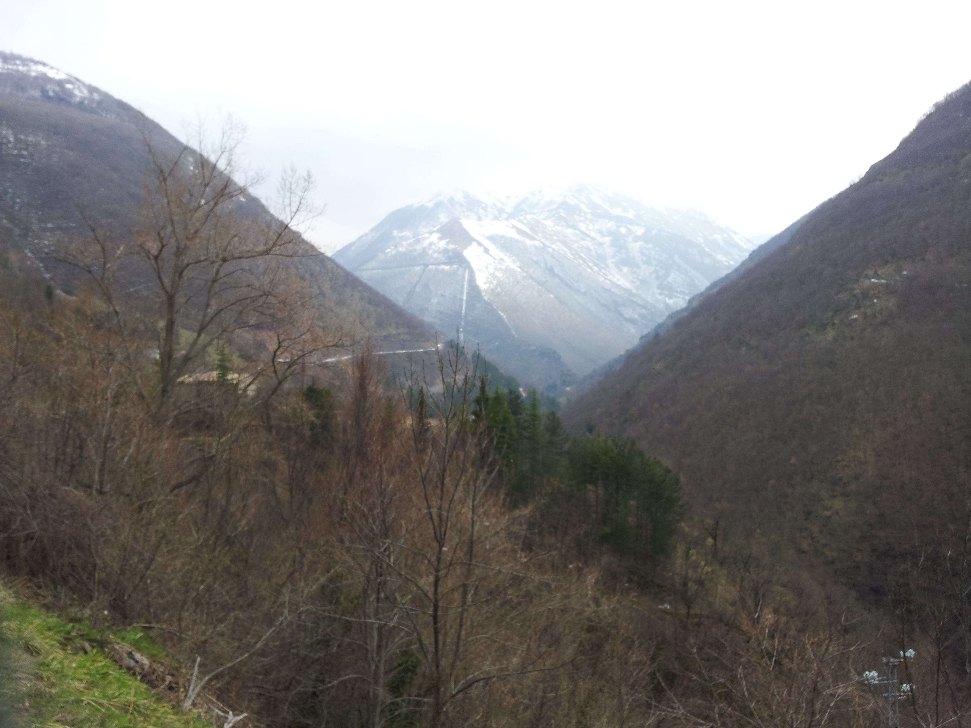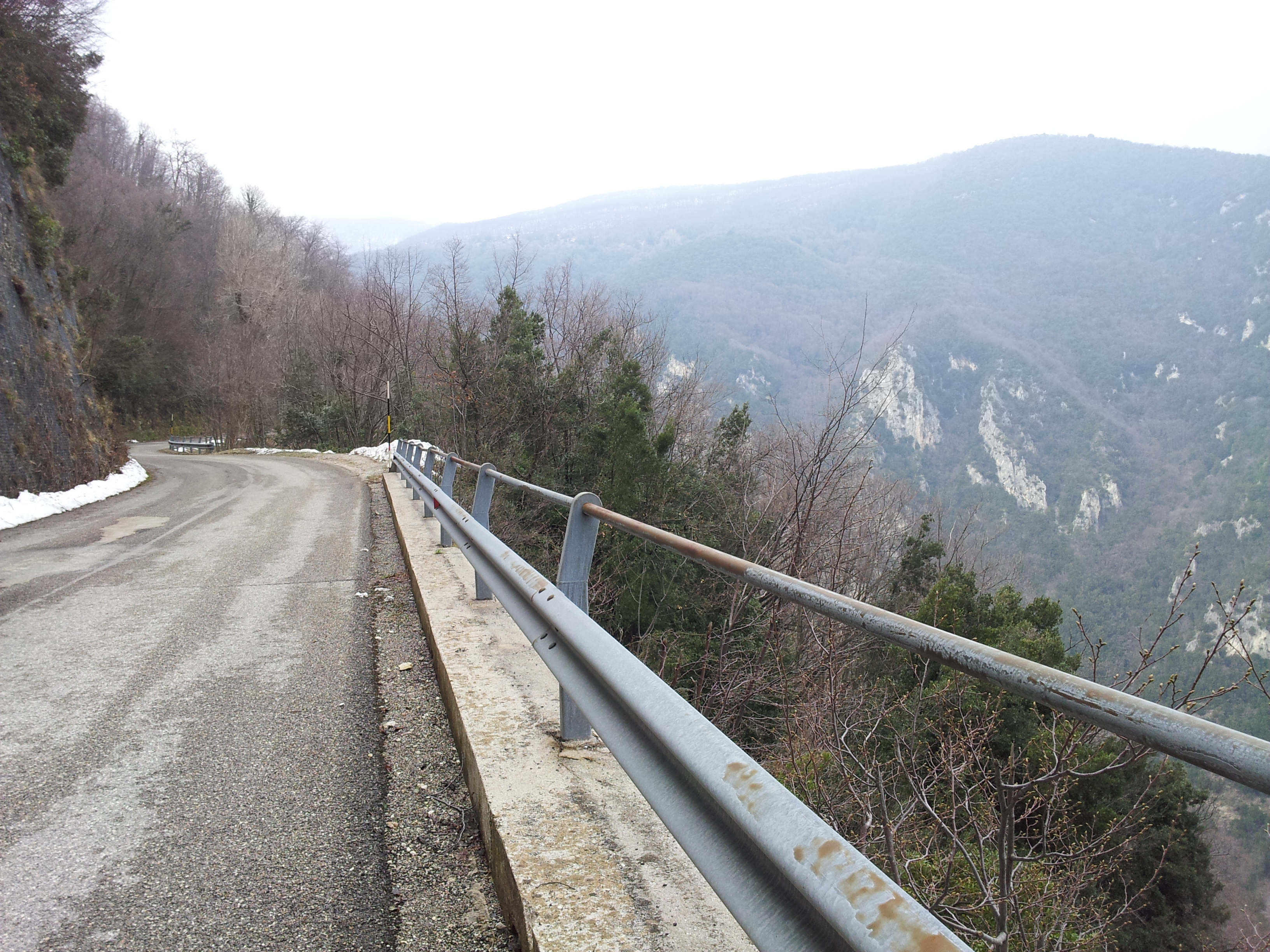 Certo che di neve sul versante adriatico dell’Appennino ne ha fatta davvero tanta! Ancora adesso ed anche a quote piuttosto basse le strade erano delimitate da piccoli bordini di neve ammucchiata, chiazze sui prati e via discorrendo. Un’altra cosa che mi ha colpito è stato l’enorme numero di alberi con i rami spezzati a causa del vento fortissimo delle scorse settimane. Lo stato delle strade era per lo più piuttosto malmesso ma tutto sommato accettabile. Ne ho viste di peggiori!
