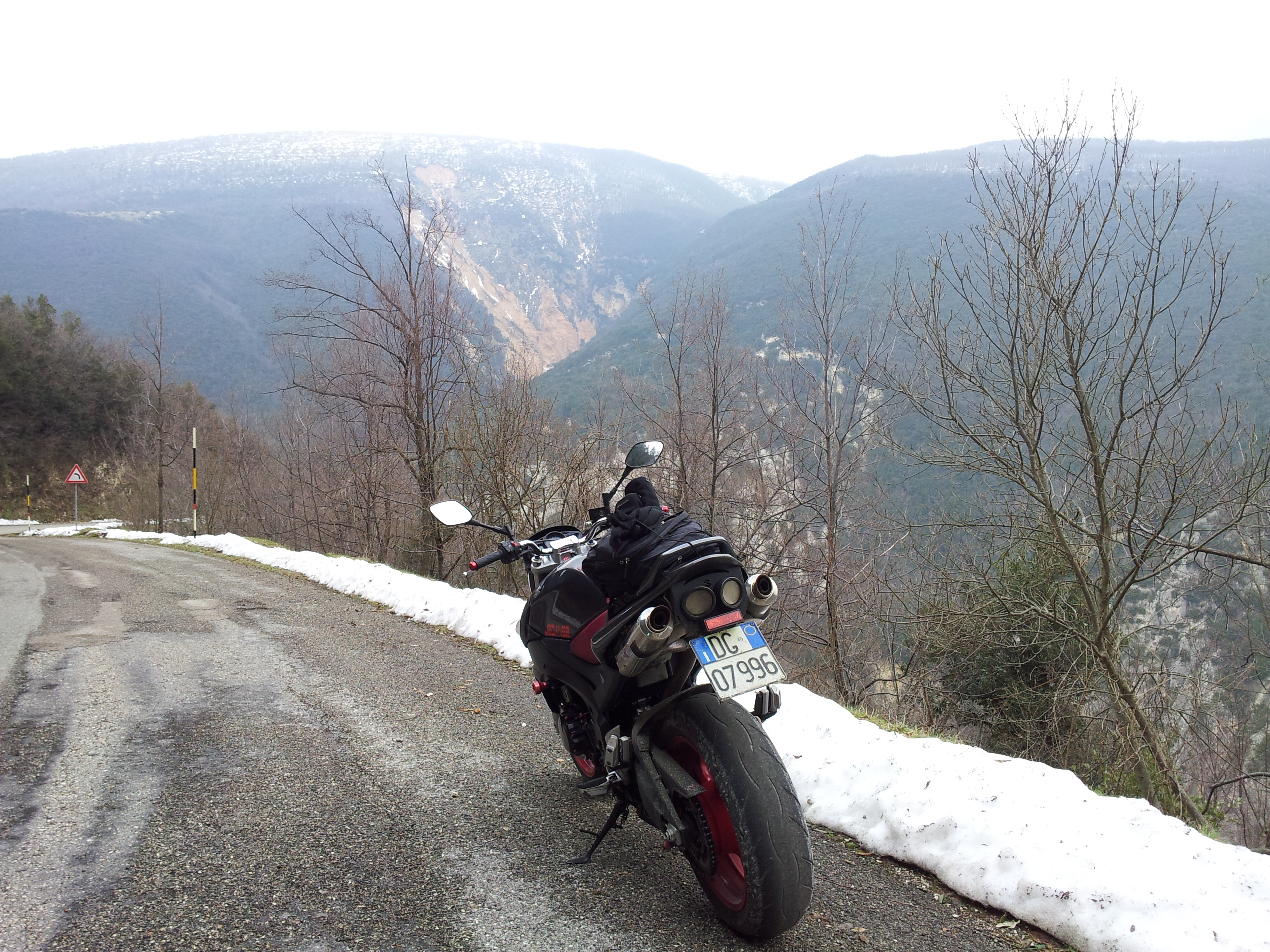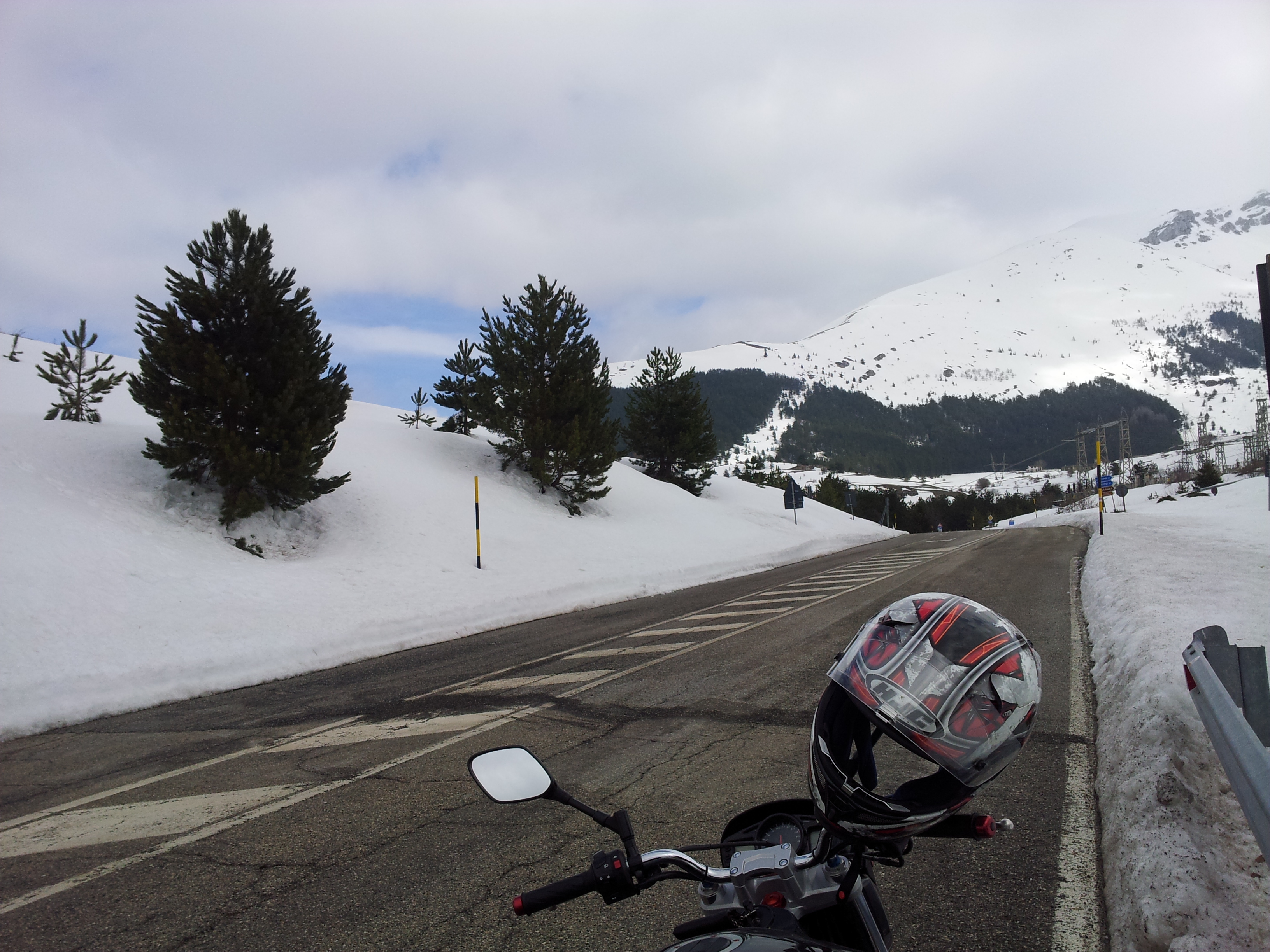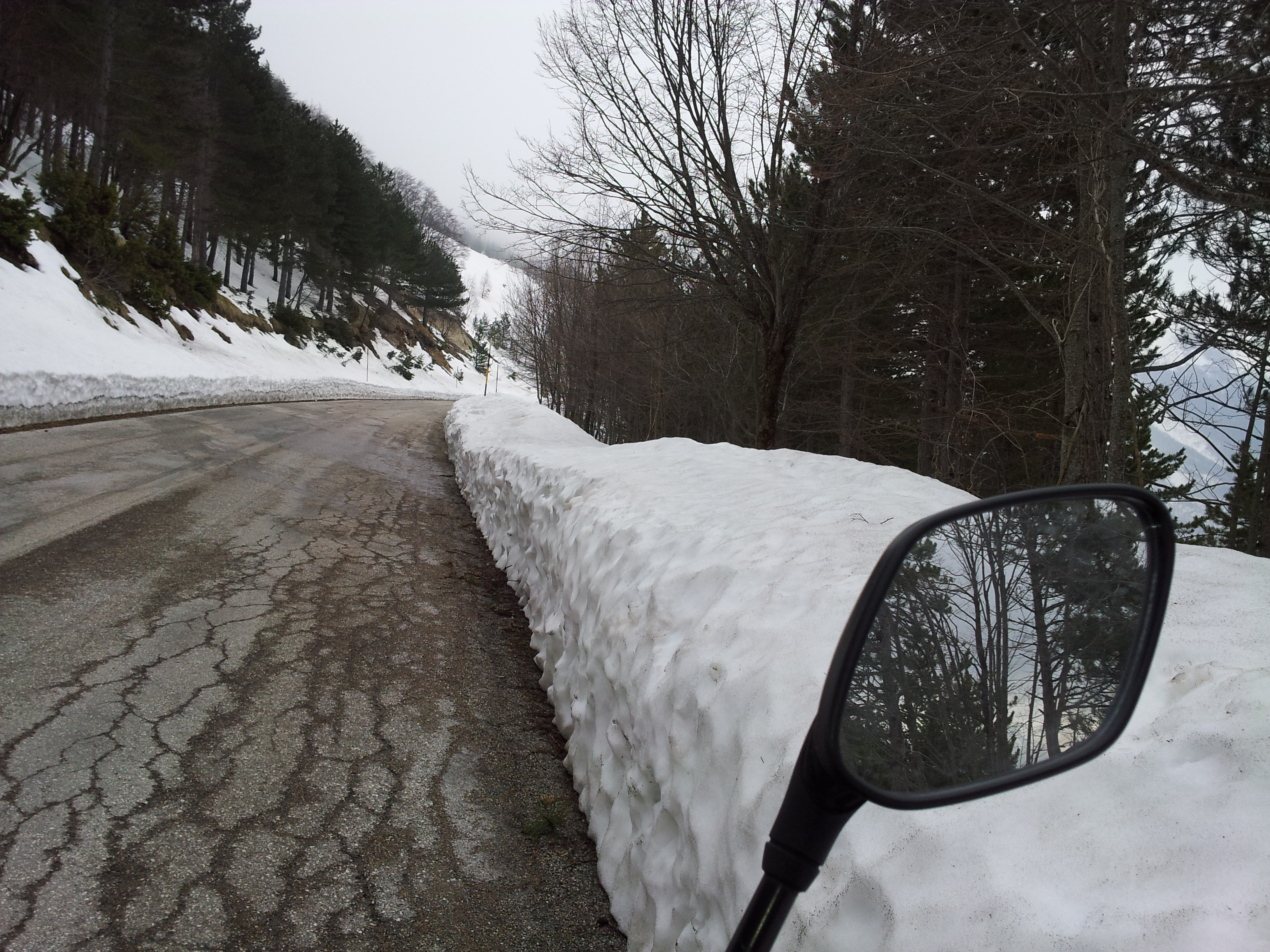 La salita fino al valico delle Capannelle che tante volte mi ha regalato belle emozioni oggi è prudente. Strada umidiccia, sale e pietrisco per terra, oltre che parecchia neve ai lati, suggeriscono di godersela e prendersela comoda. A parte qualche tratto sarà così per tutto il tragitto fino a Teramo.