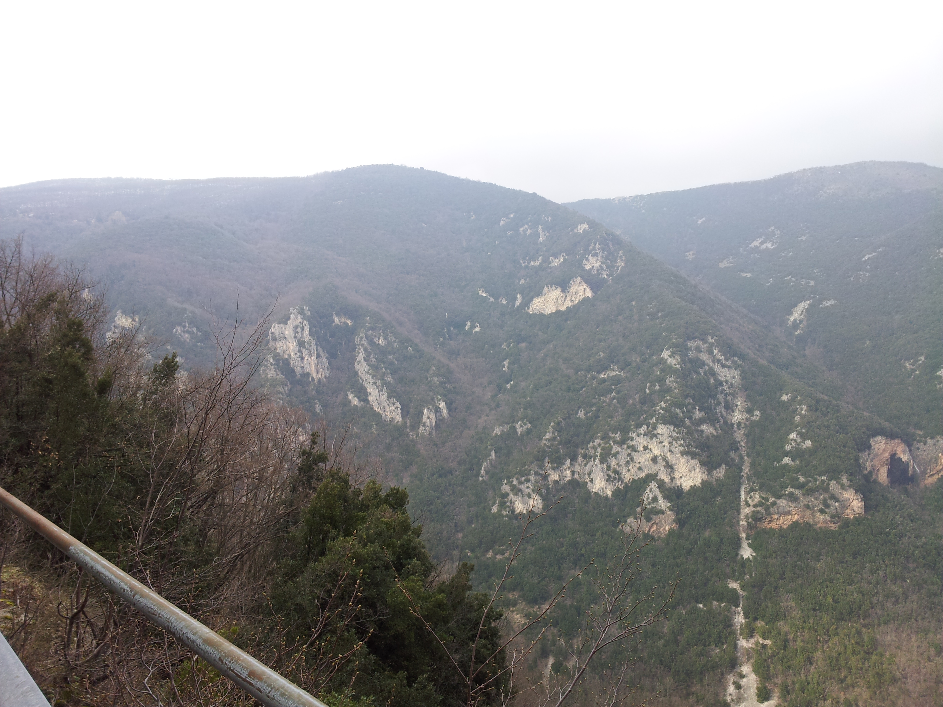 Da qui in poi e fino a Muccia per me tutto nuovo! La salita verso Roccafluvione, Amandola (il paese col vicolo più stretto d’Italia!) e Sarnano offre sulla sinistra degli scorci del Monte Vettore e del Monte Sibilla molto particolari, del tutto nuovi, con le pareti nord e sud dei due contrapposte che scendono rapidamente a formare una stretta gola. A Sarnano avrei dovuto prendere subito ad Est per Bolognola ma ho sbagliato tirando dritto: forse è stato meglio perché avrei trovato la strada che sale diretta verso questa località invernale dei Sibillini abbastanza impegnativa vista la neve abbondante ai lati e la copertura nuvolosa che si sarebbe trasformata in nebbia.