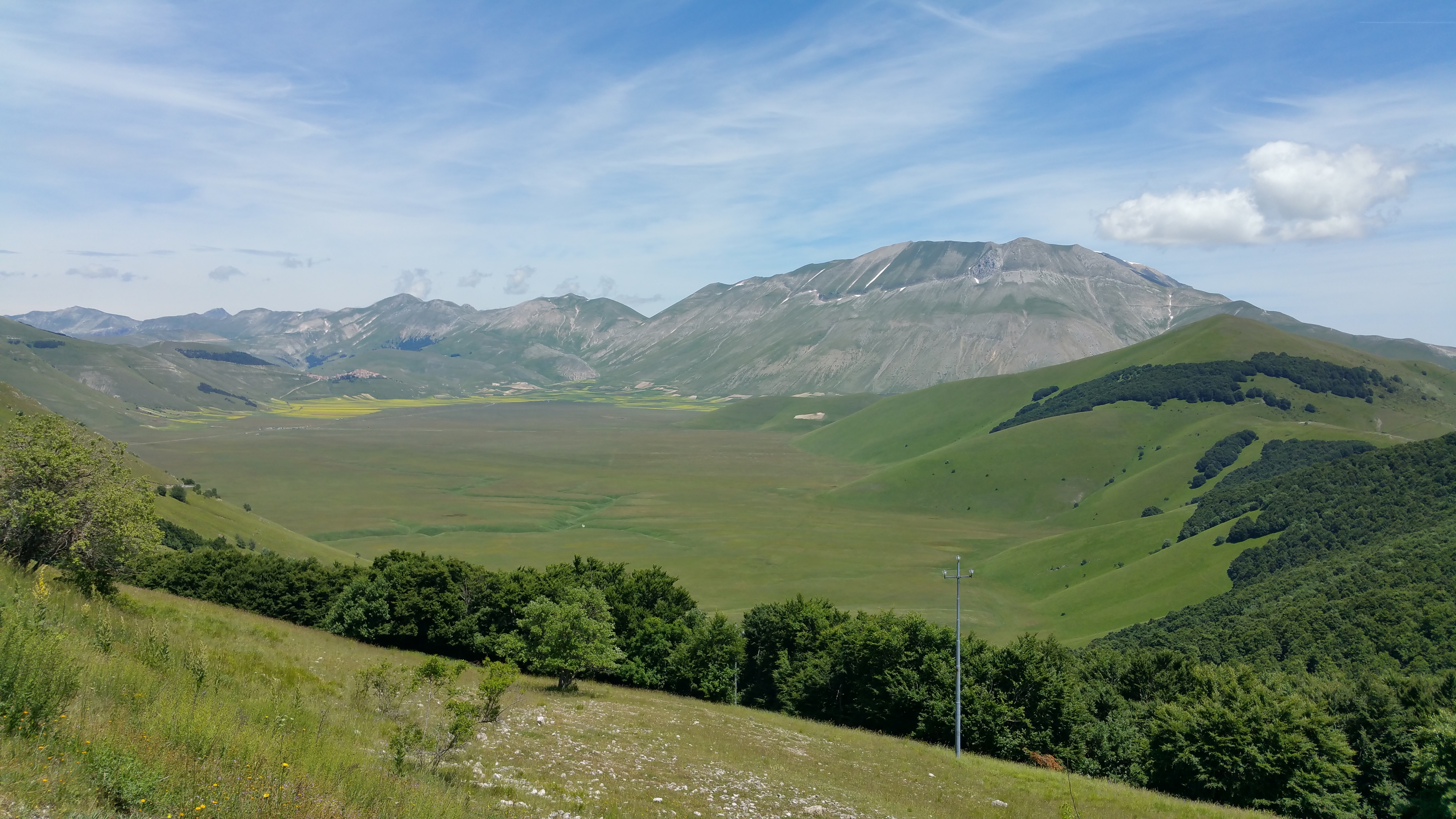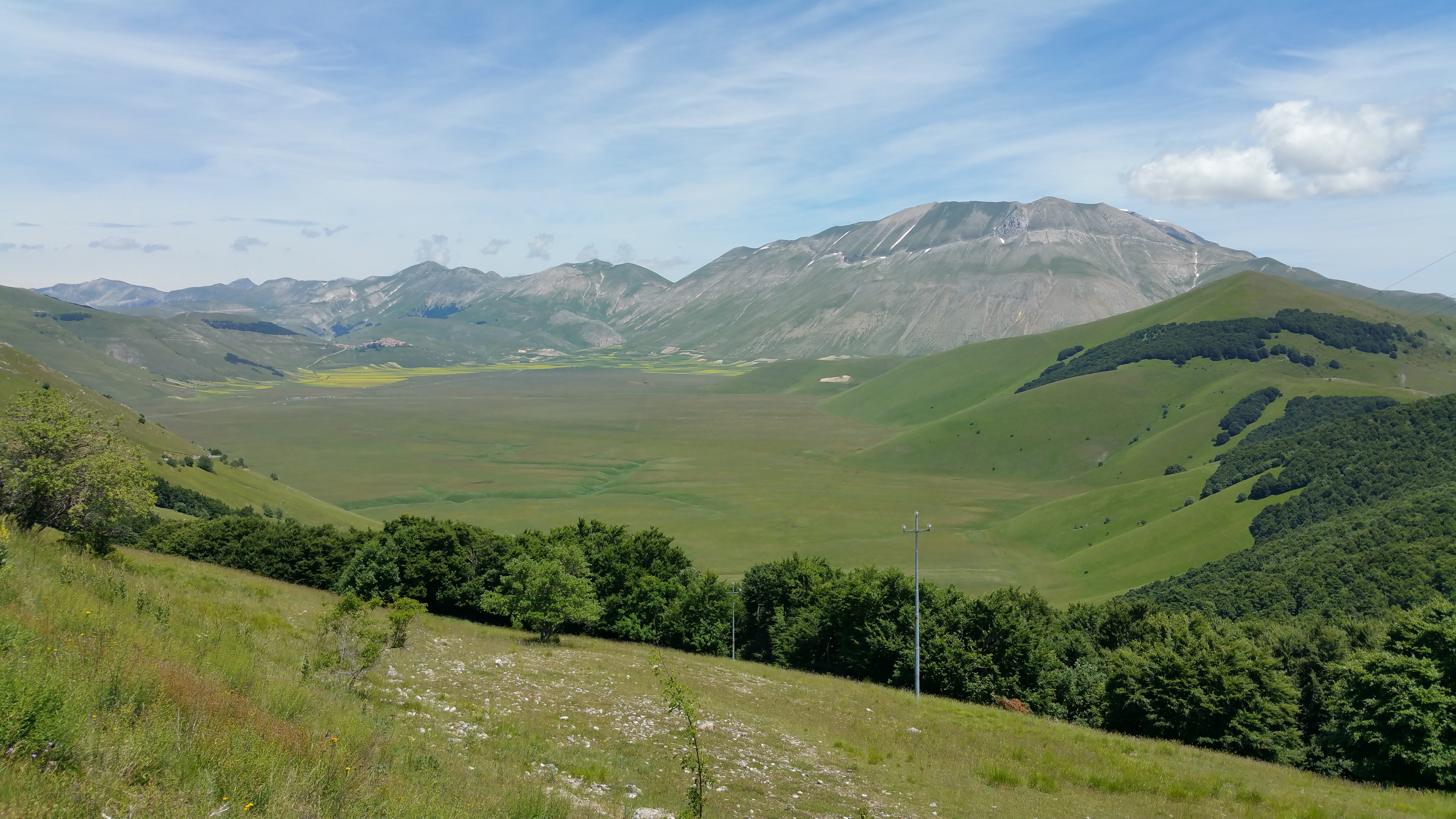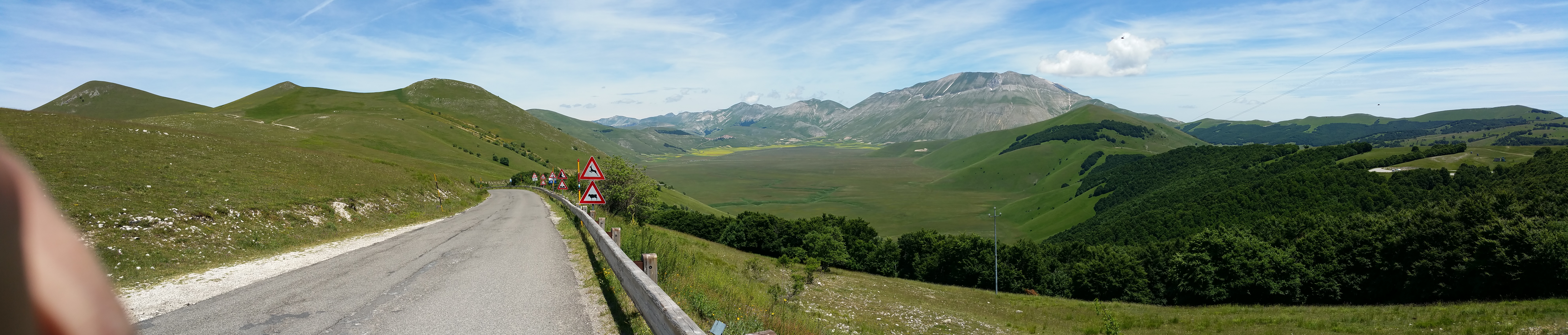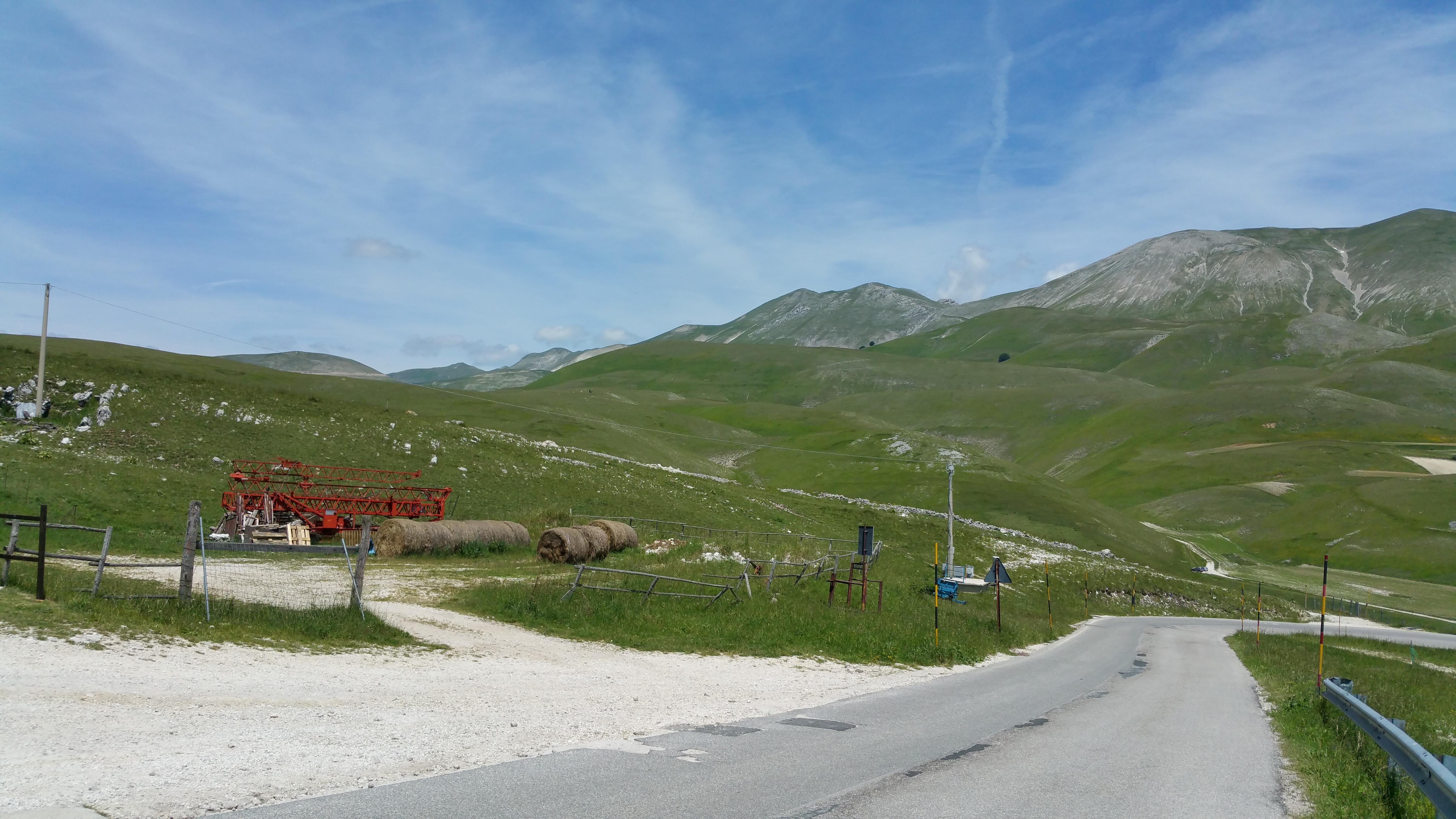 Da Leonessa ancora a nord, l’obiettivo è raggiungere la piana di Castelluccio di Norcia che in questo periodo dovrebbe esprimere il massimo dei colori con la fioritura delle lenticchie! Il paesaggio ovunque è verdissimo in questo inizio estate tutto sommato ancora piuttosto umido. Non ricordavo così lunga la salita, bellissima con l’ampia piana di Norcia sotto di noi e le cime del gruppo del Terminillo verso sud.