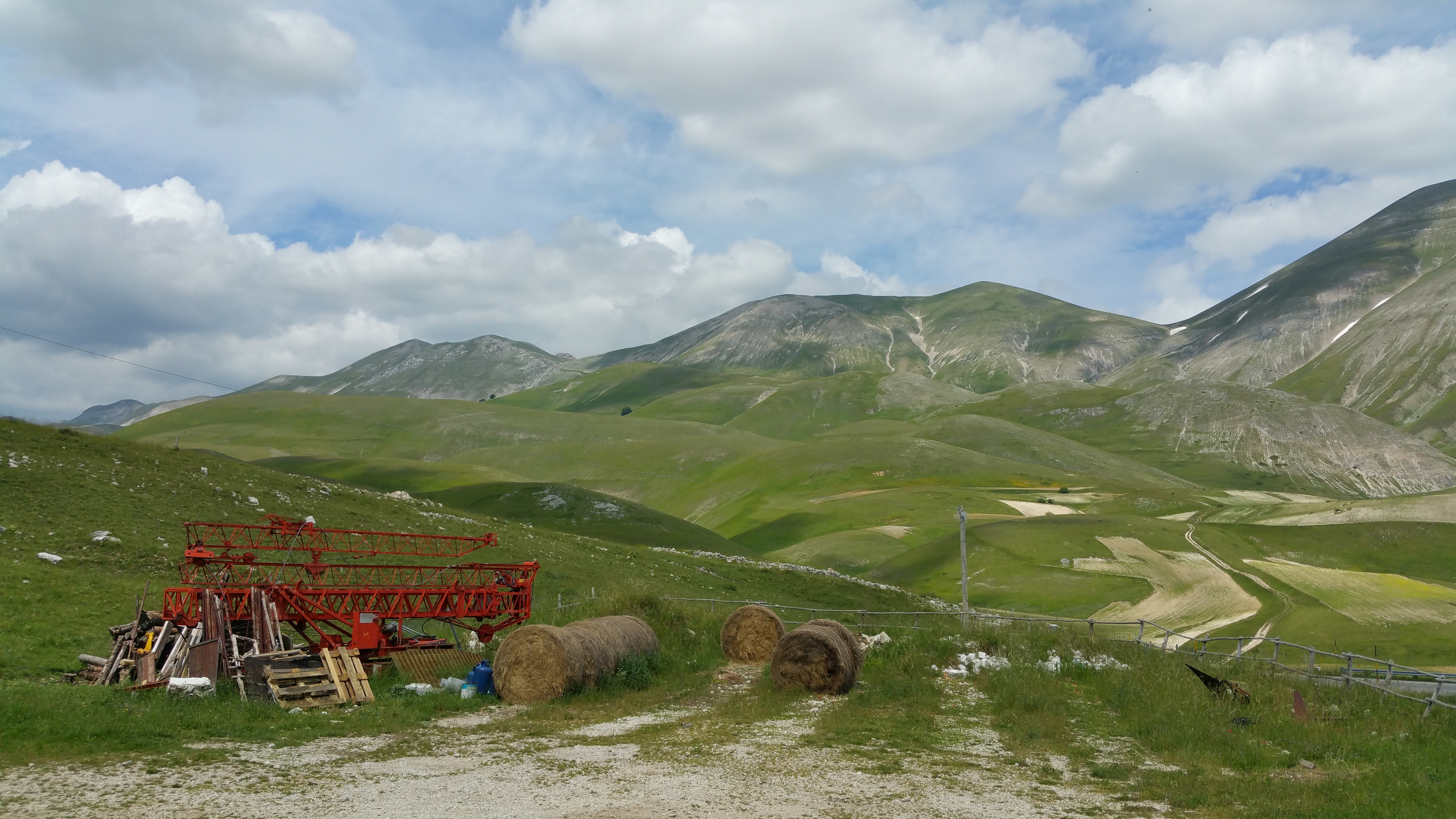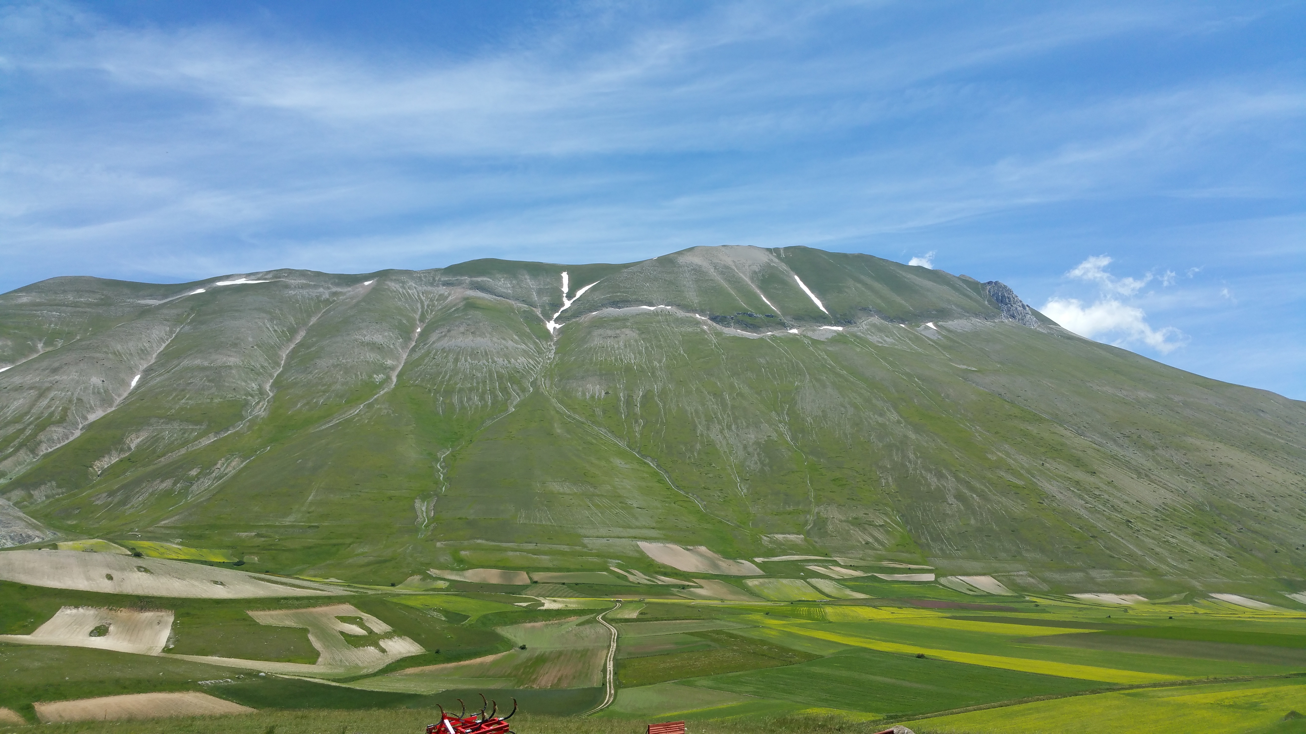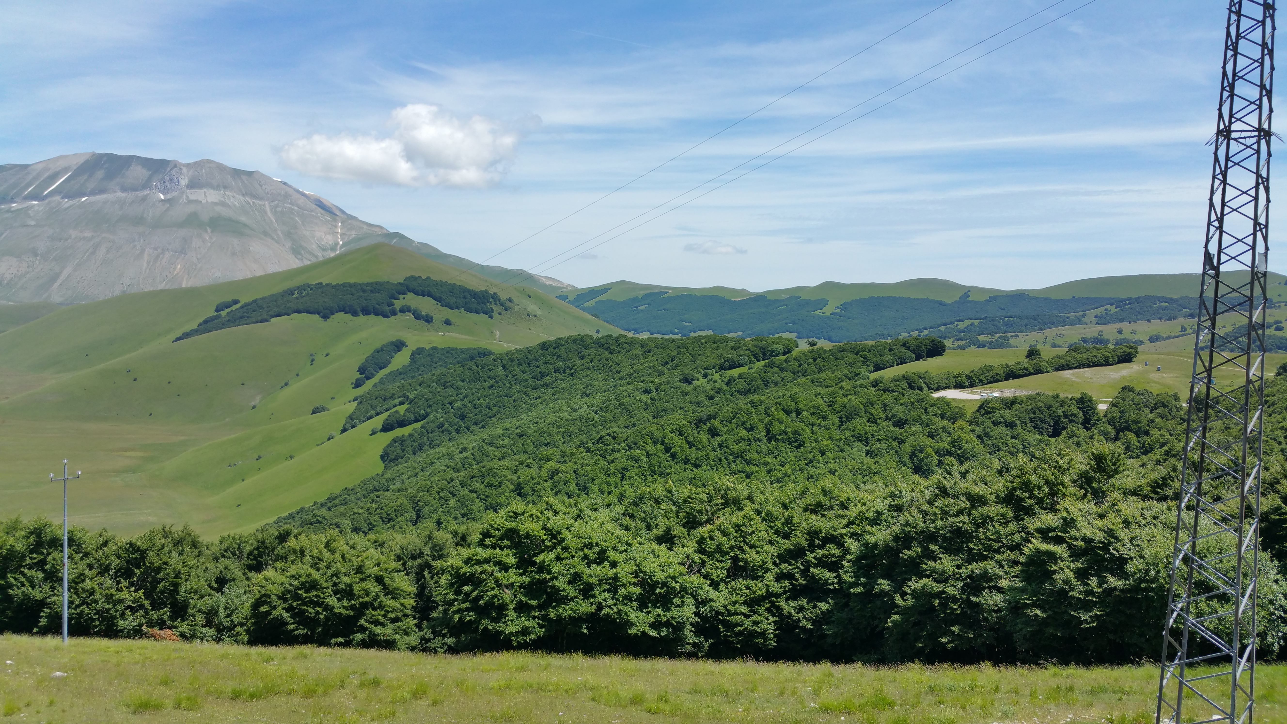 Da Leonessa ancora a nord, l’obiettivo è raggiungere la piana di Castelluccio di Norcia che in questo periodo dovrebbe esprimere il massimo dei colori con la fioritura delle lenticchie! Il paesaggio ovunque è verdissimo in questo inizio estate tutto sommato ancora piuttosto umido. Non ricordavo così lunga la salita, bellissima con l’ampia piana di Norcia sotto di noi e le cime del gruppo del Terminillo verso sud.