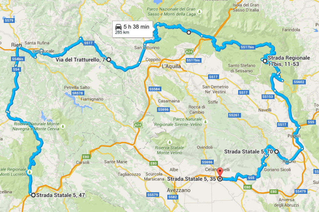 SS 17bis, per l’aspetto paesaggistico notevole, tra la SS 80 e Fonte Cerreto e da qui fino a Castel del Monte