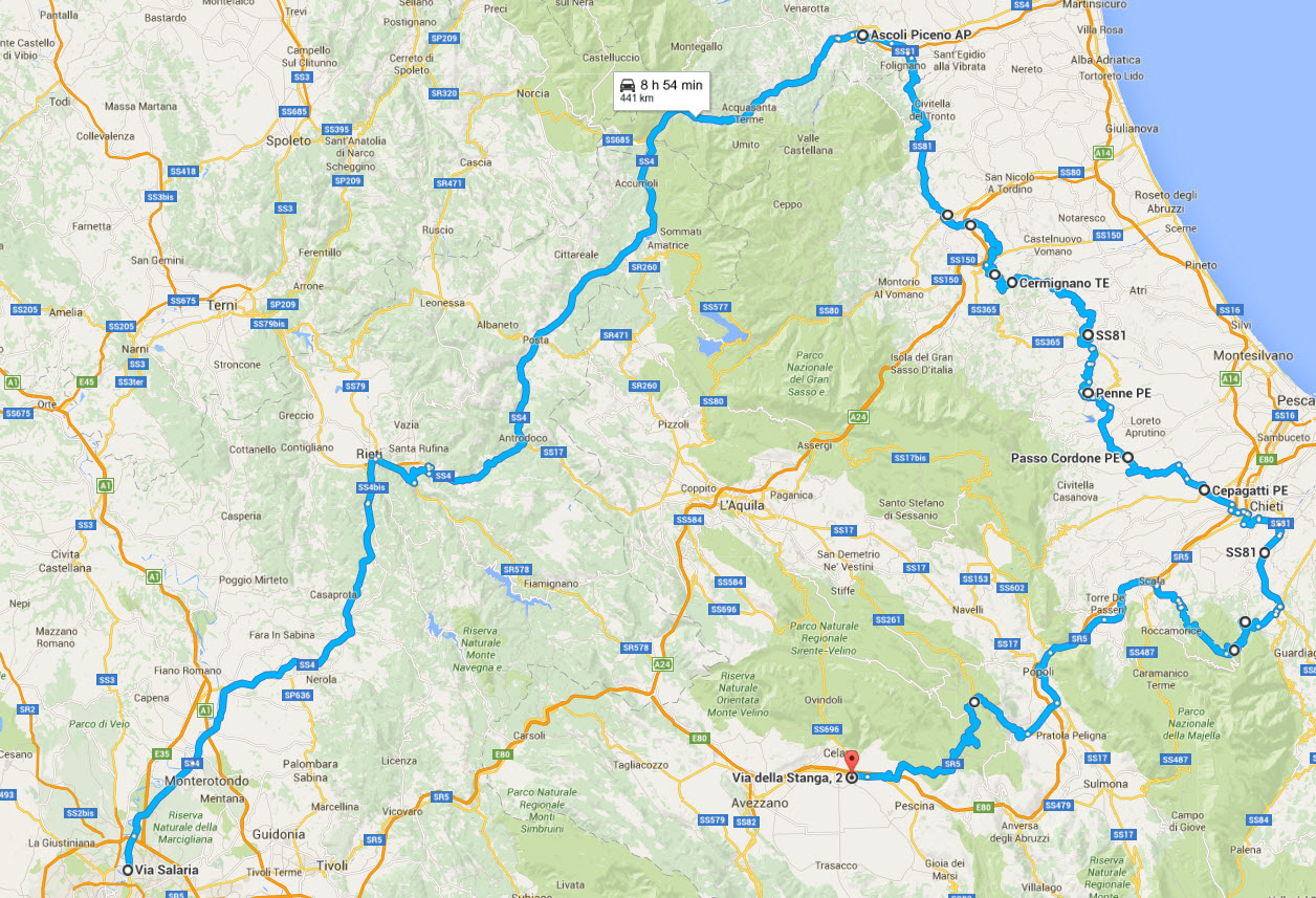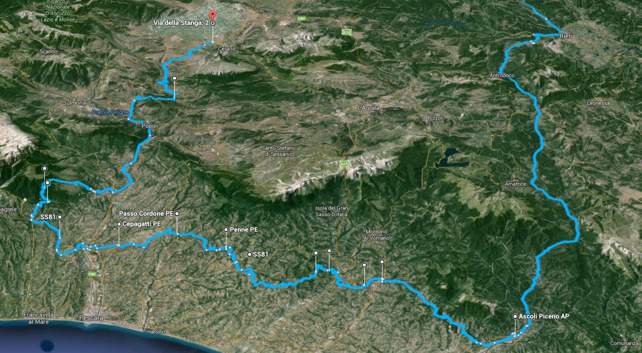 La SS 81, si snoda lungo la dorsale collinare adriatica, percorrendo tutta la fascia pedemontana abruzzese ad una ventina di km in linea d’aria dal mare; ne ricalca l’andamento dolcemente tortuoso ricordando per molti aspetti le colline marchigiane, anche se qui in complesso c’è meno verde. Da Ascoli Piceno a Teramo è il tratto a noi molto noto, percorso in entrambe le direzioni più volte e con ogni stagione. Ma da Teramo in poi è stata una vera scoperta!
