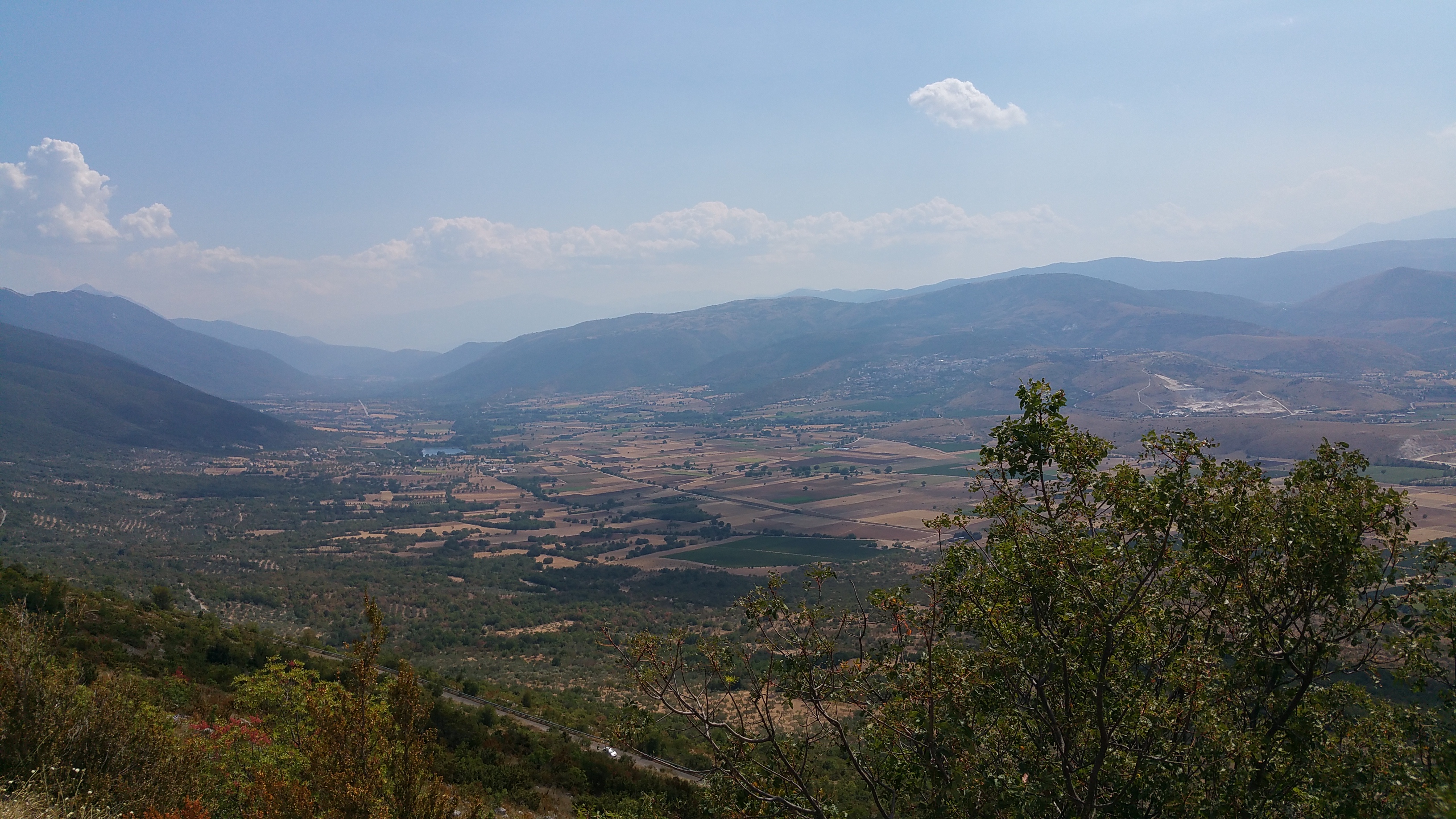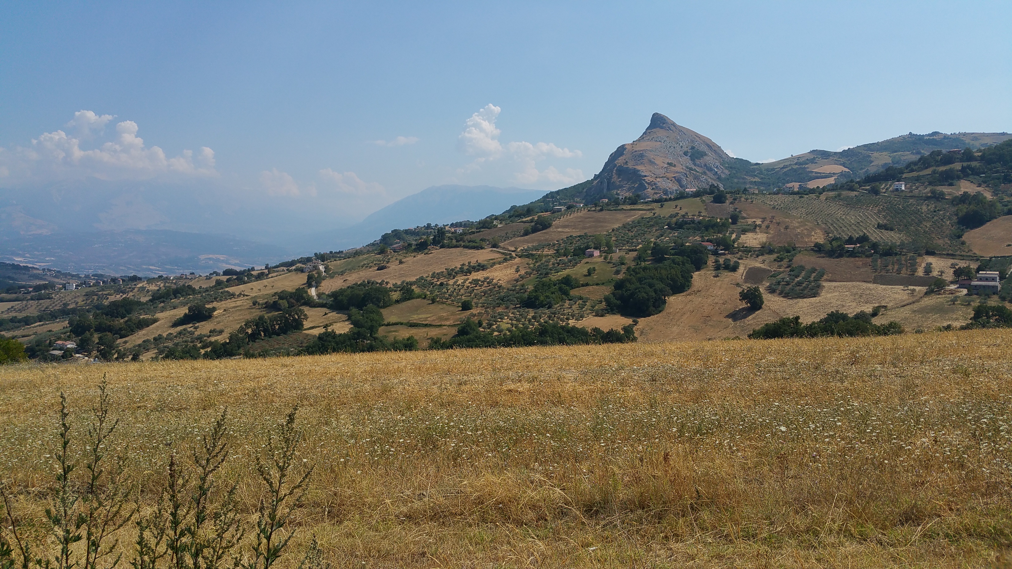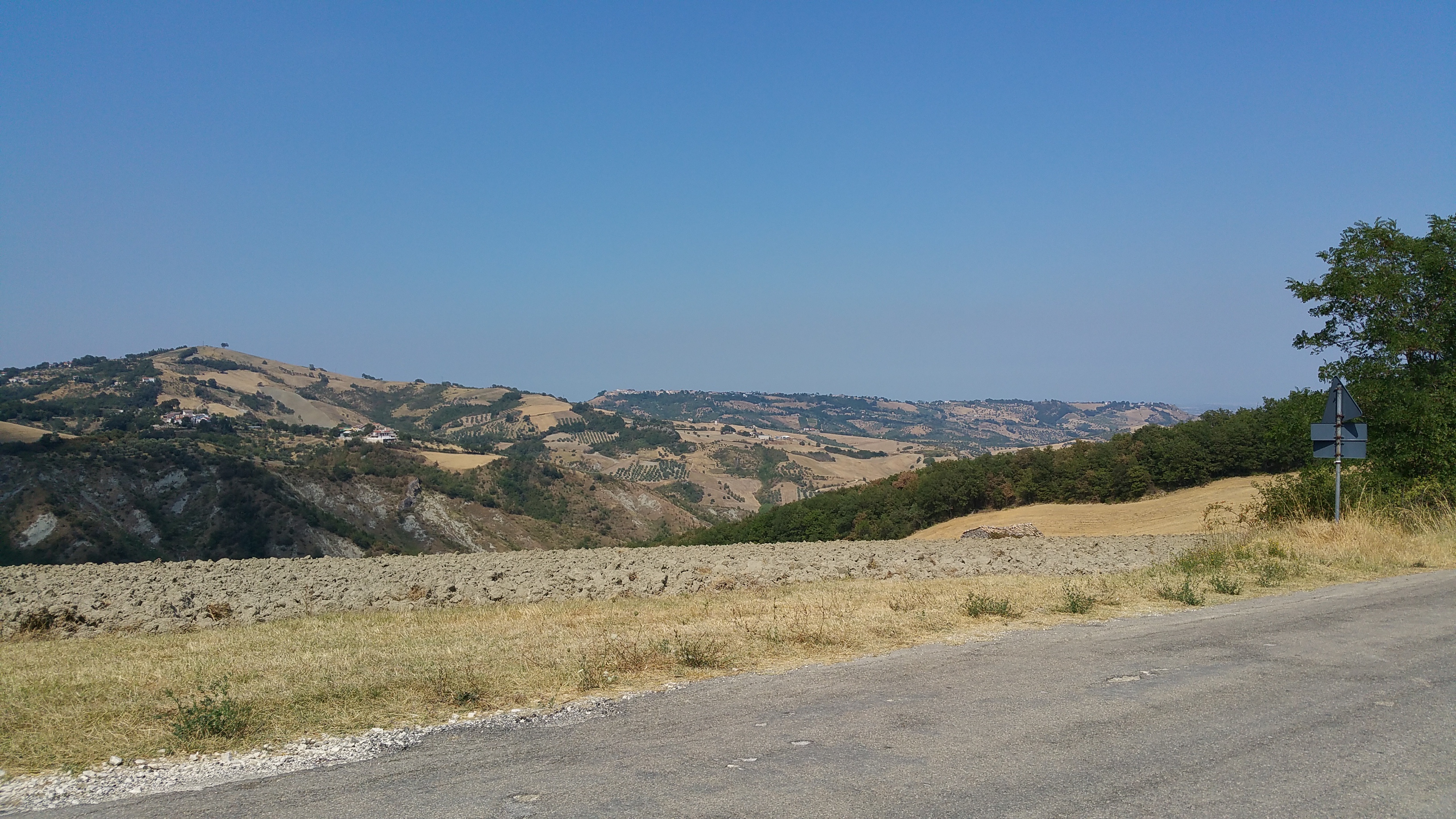 Al valico prendo verso destra, verso sud, per raggiungere la Tiburtina all’altezza di Torre dei Passeri con stradelle mai fatte prima che si aprono verso la distesa di colline che degradano fino all’Adriatico che si distingue appena nella foschia della calura.