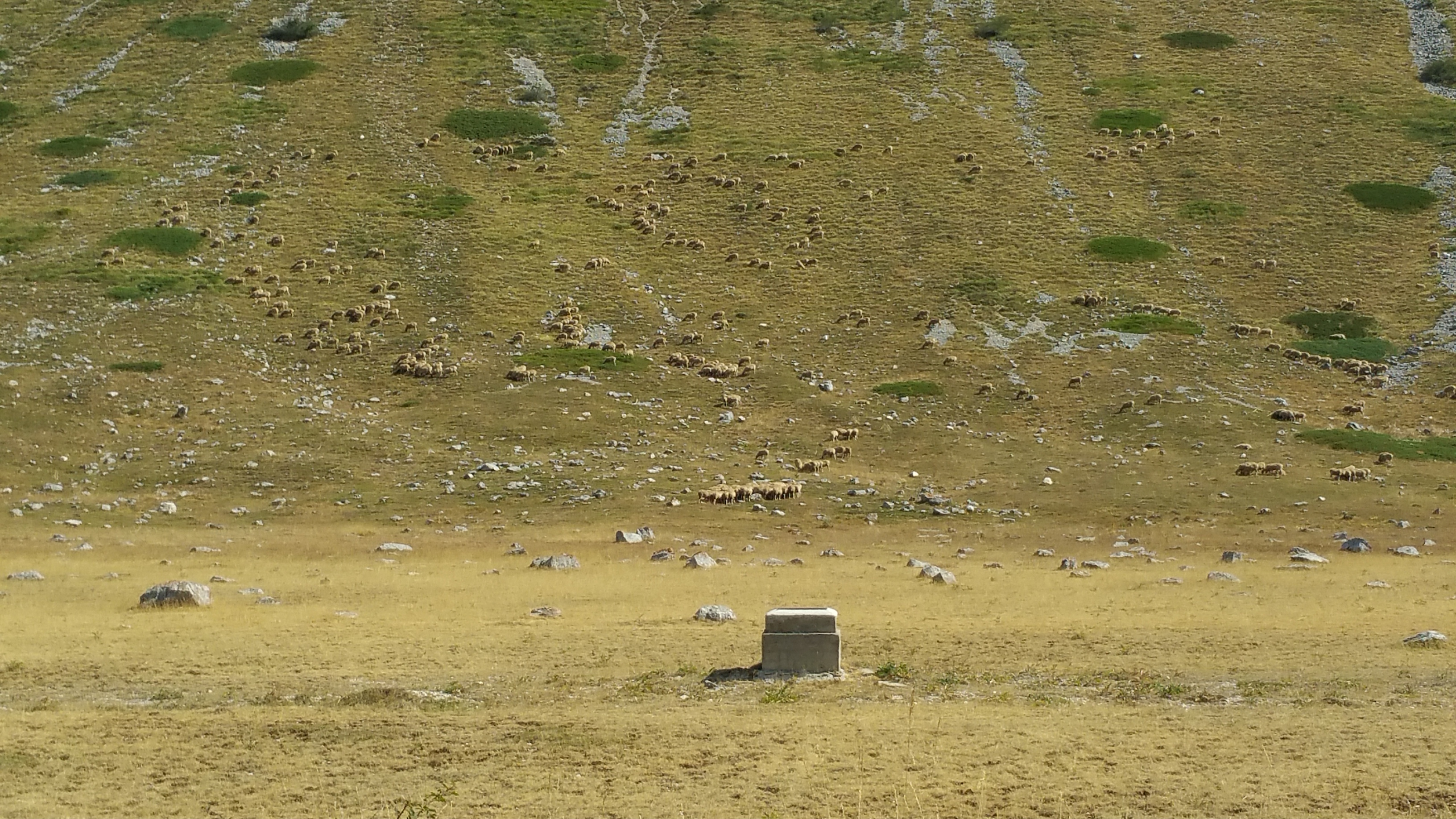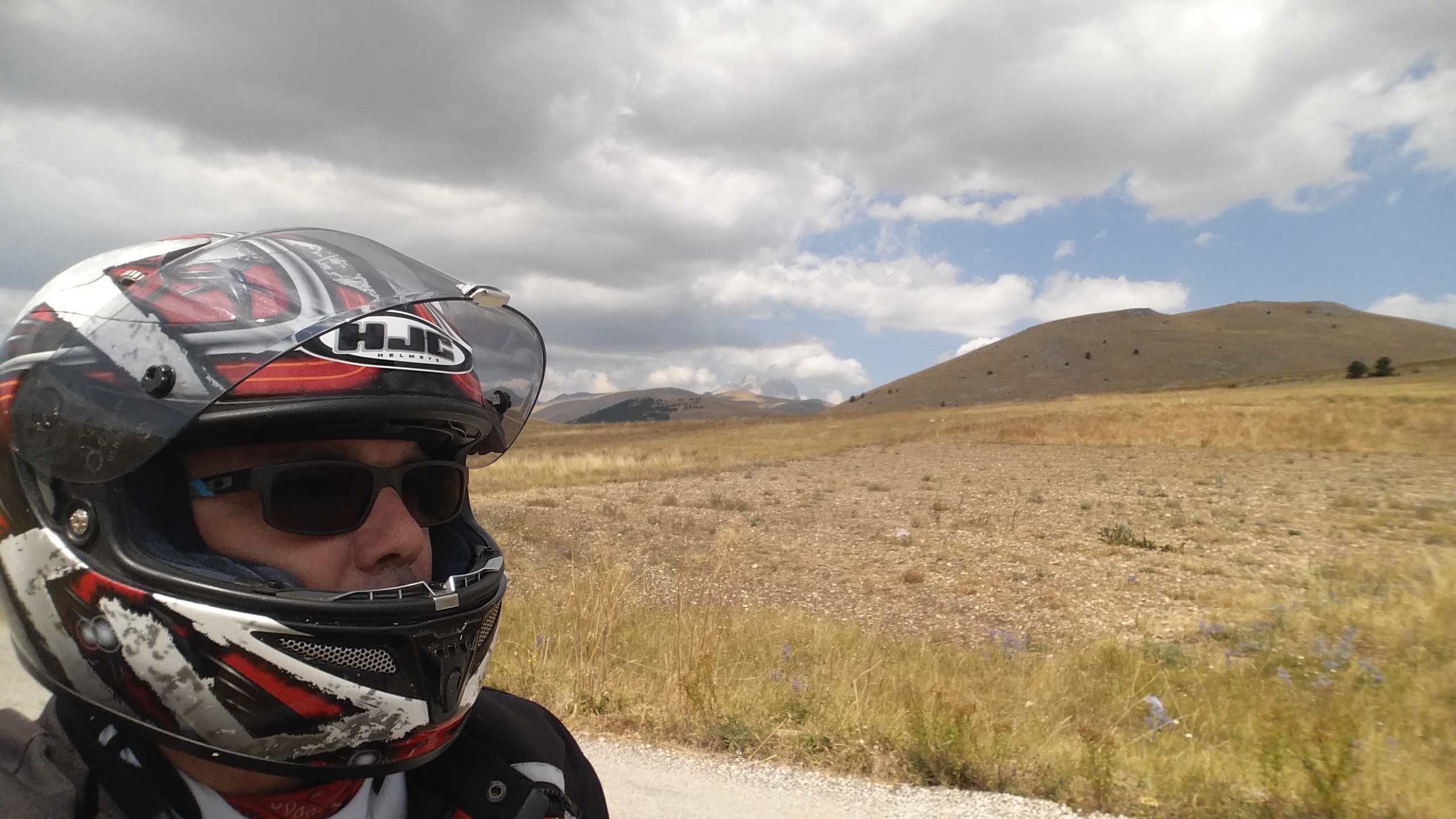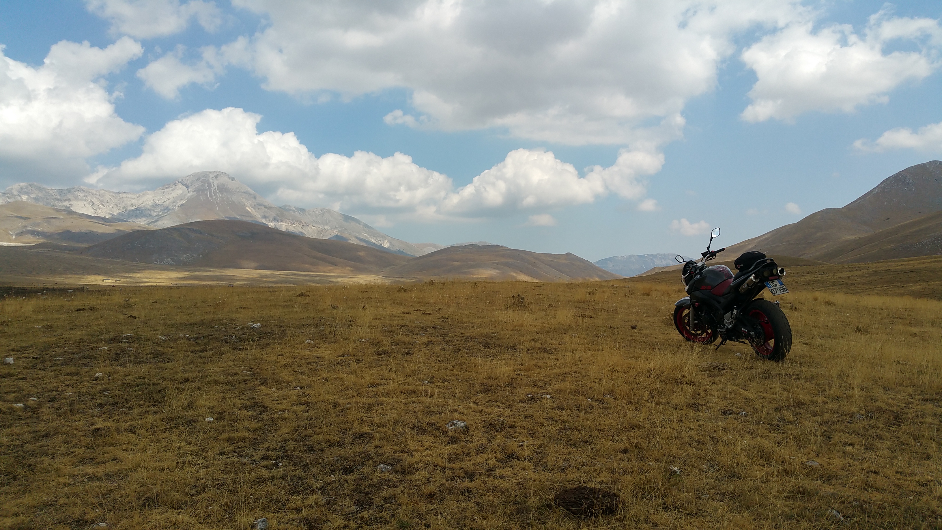 La salita, fatta appena ieri in macchina, verso Santo Stefano di Sessanio in moto è tutta un’altra cosa, ovviamente! Ma ancora più bella e soprattutto riscoperta dopo diversi anni, quella da Santo Stefano a Fonte Vedica. I colori della terra riarsa e della vegetazione dal giallo all’ocra sono bellissimi con questa luce grigiastra a causa dei nuvoloni che incombono bassi, ma non pioverà. A tratti esce il sole.