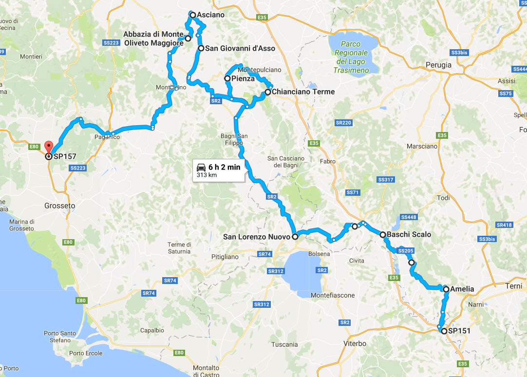 Con un obiettivo abbastanza ben delineato una volta raggiunta Orte via A1 percorriamo la notissima strada che sovrasta la valle del Tevere da Amelia fino ad Orvieto Scalo dove ci spostiamo decisamente ad Ovest sulla Cassia all’altezza di San Lorenzo Nuovo.