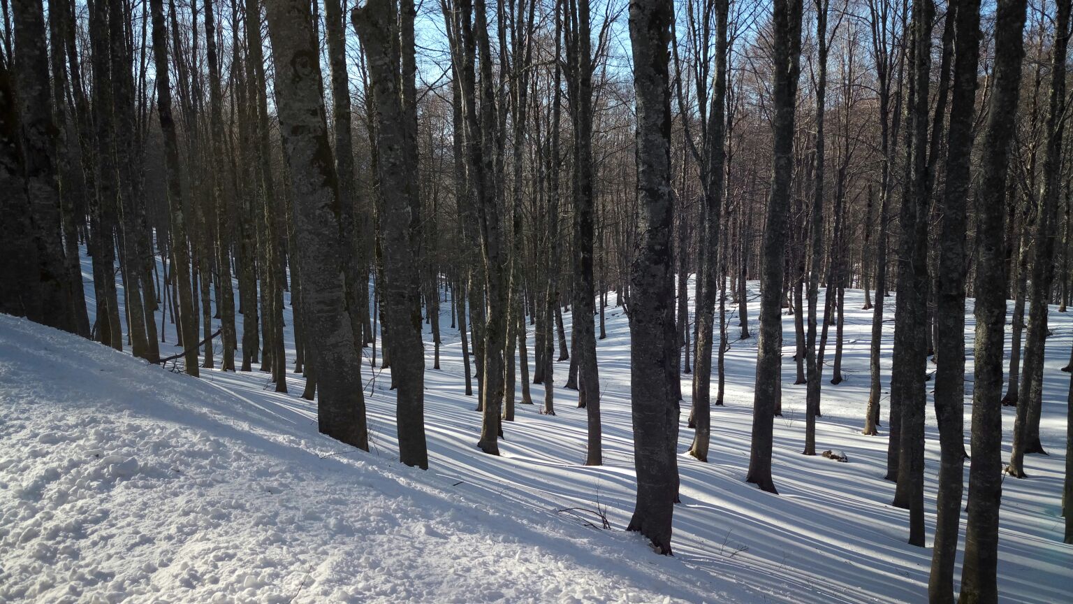 Con calma e rilassati ci godiamo il paesaggio fino a fermarci nel bellissimo bosco innevato quasi al valico di Forca d’Acero. Col sole quasi al tramonto la luce rende tutto ancora più bello.