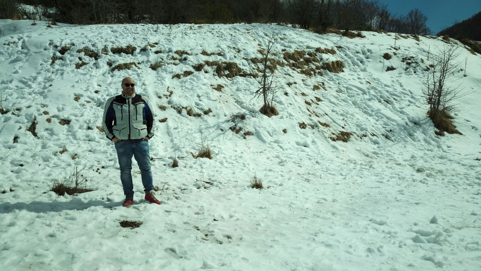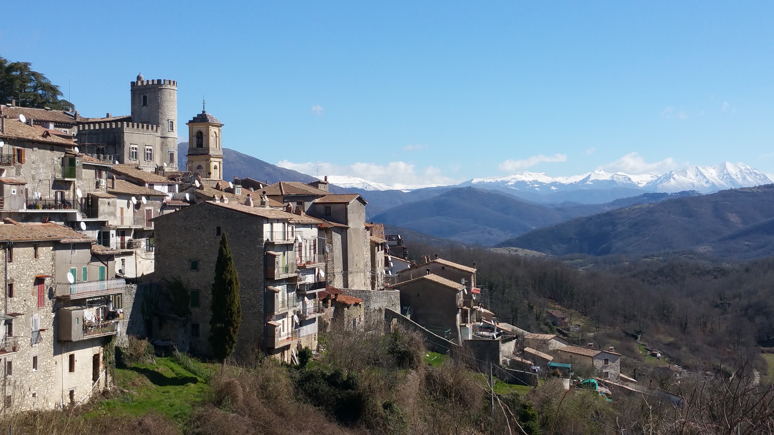 Evitiamo la noiosa Tiburtina tra Magliano dei Marsi e Pescina con un breve tratto di autostrada. Un venticello da nord rinfresca decisamente l’aria nonostante il sole alto nel cielo. E infatti salendo da Pescina verso il valico di Gioia Vecchio, noto anche come “passo del diavolo”, l’aria si fa via via più fredda e intorno ai 1000 metri la neve ricopre abbondantemente prati e boschi d’intorno.