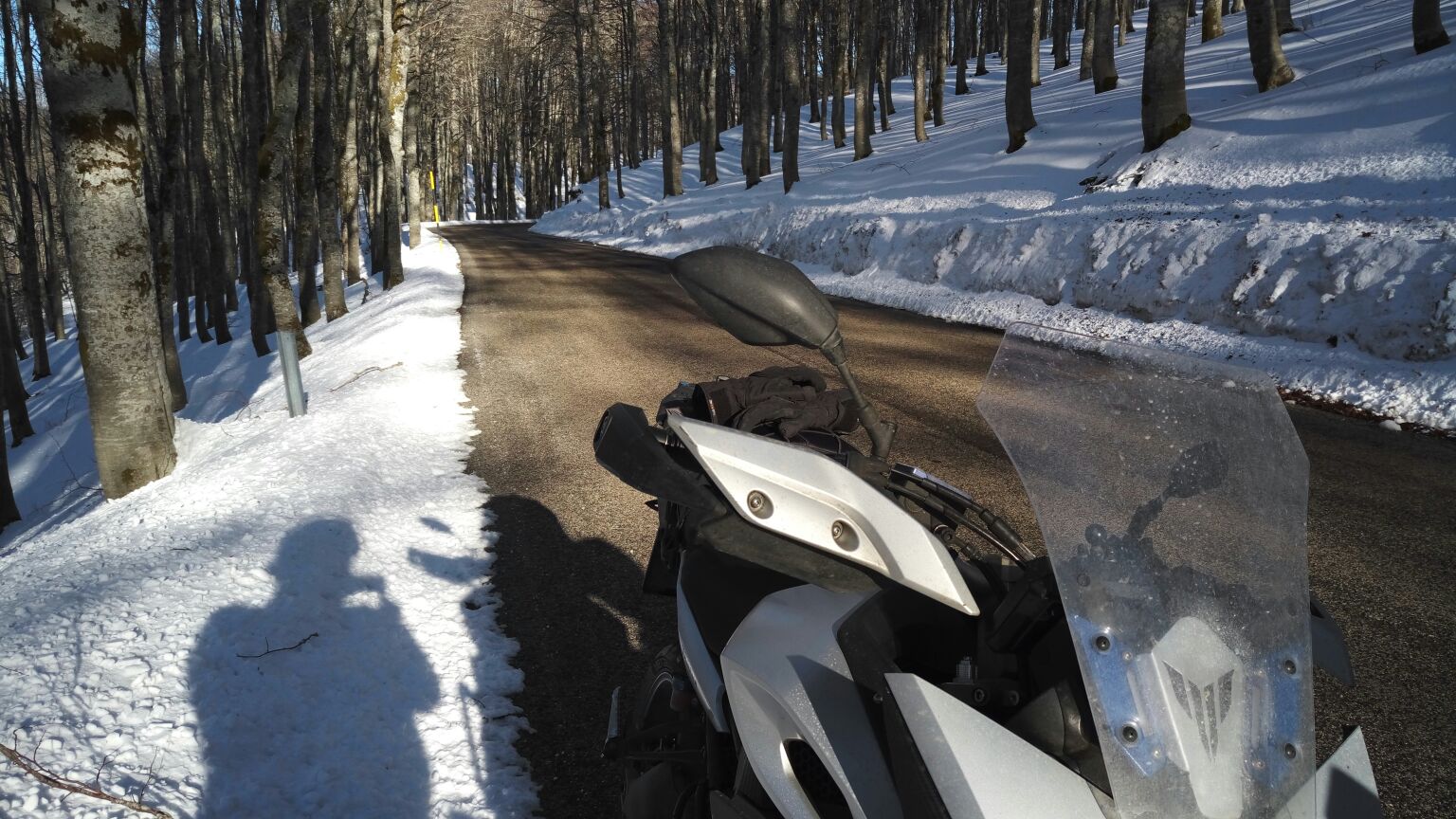 La salita divertente verso il valico dei Colli di Montebove invita ad osare e così è stato, nonostante alla prima curva appena fuori Carsoli un po’ sabbiolina infida sull’asfalto mi abbia fatto pattinare sia l’anteriore che la posteriore! Capita! Sempre bella comunque la salita verso Marsia e la discesa verso Tagliacozzo col Velino ed il Sirente innevati che guardano da nord.