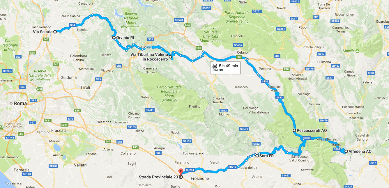 Da Passo Corese sulla Salaria raggiungiamo rapidamente il bivio per per Orvinio, percorrendo al contrario rispetto al solito una strada molto nota, e da qui scendiamo verso la Tiburtina passando da Vallinfreda e Riofreddo, toponimi che la dicono lunga sulle temperature medie di questi posti. Un altopiano assolato con paesaggi e scorci verso il Velino oltre Tagliacozzo ci accompagna per tutto il tratto.