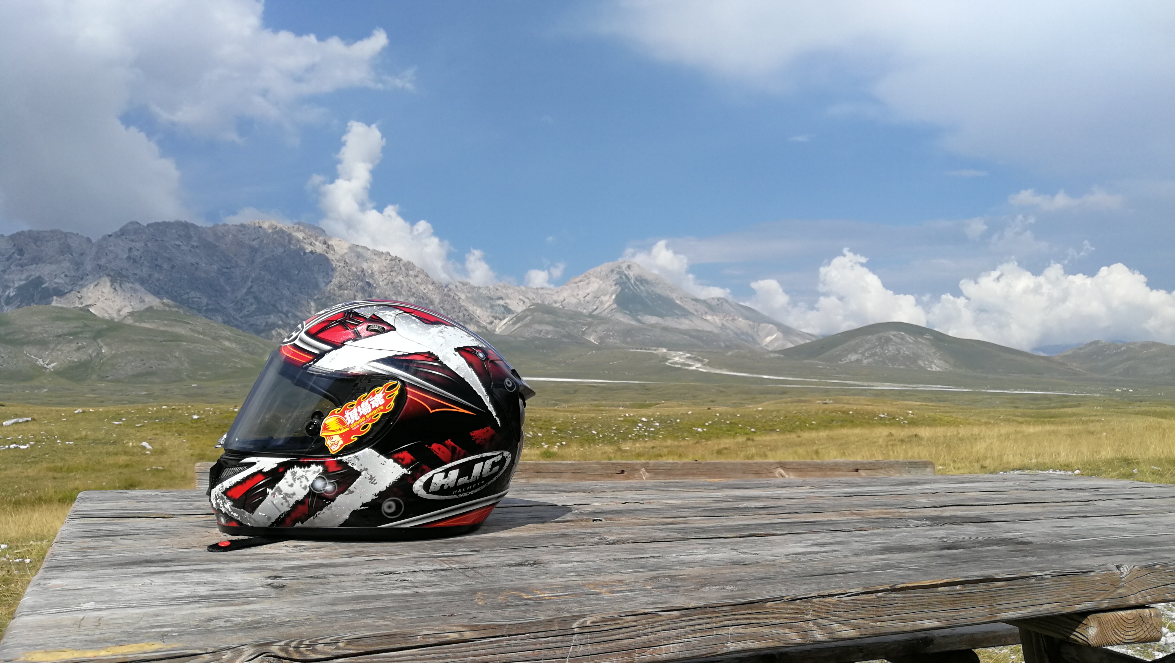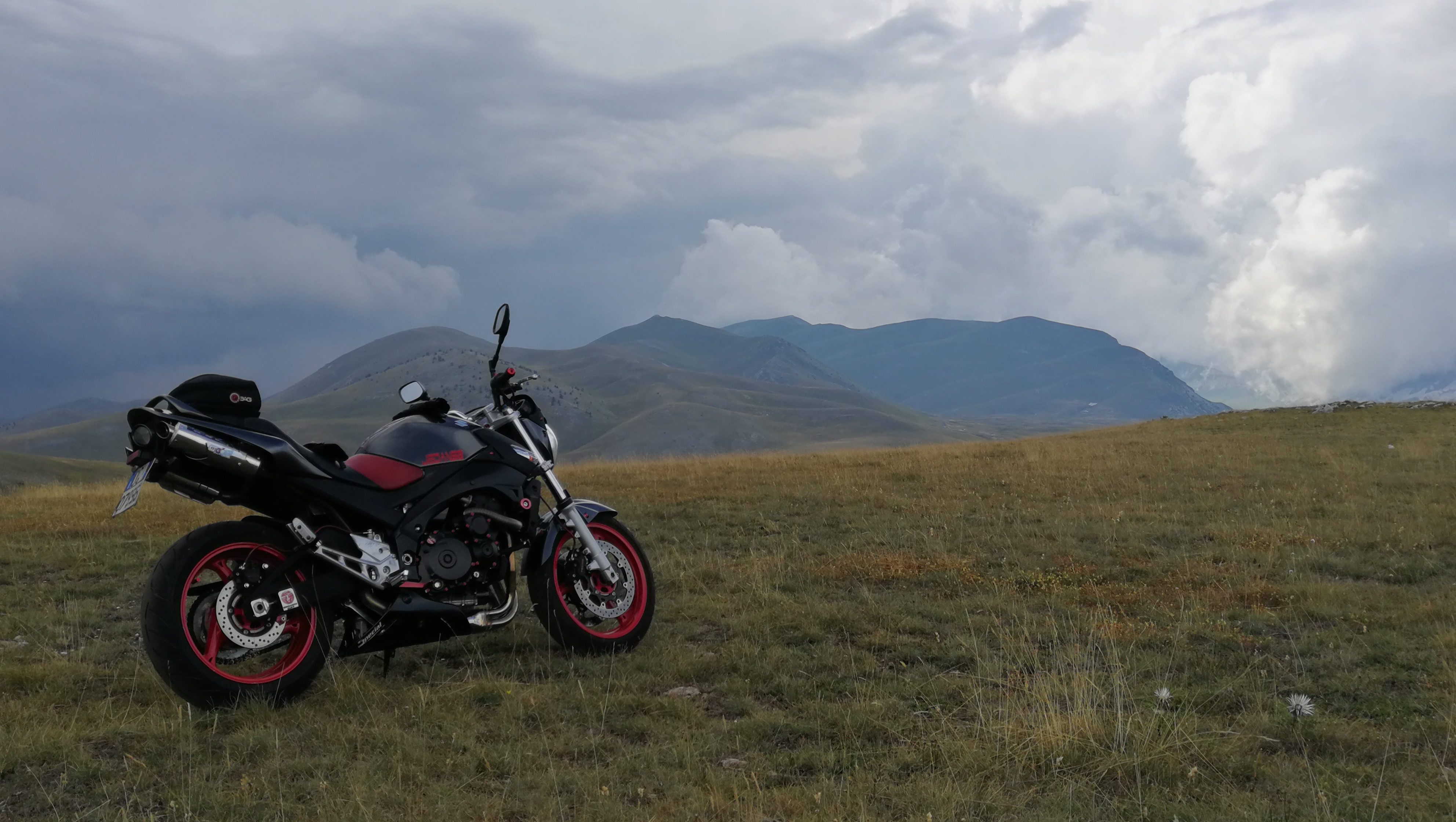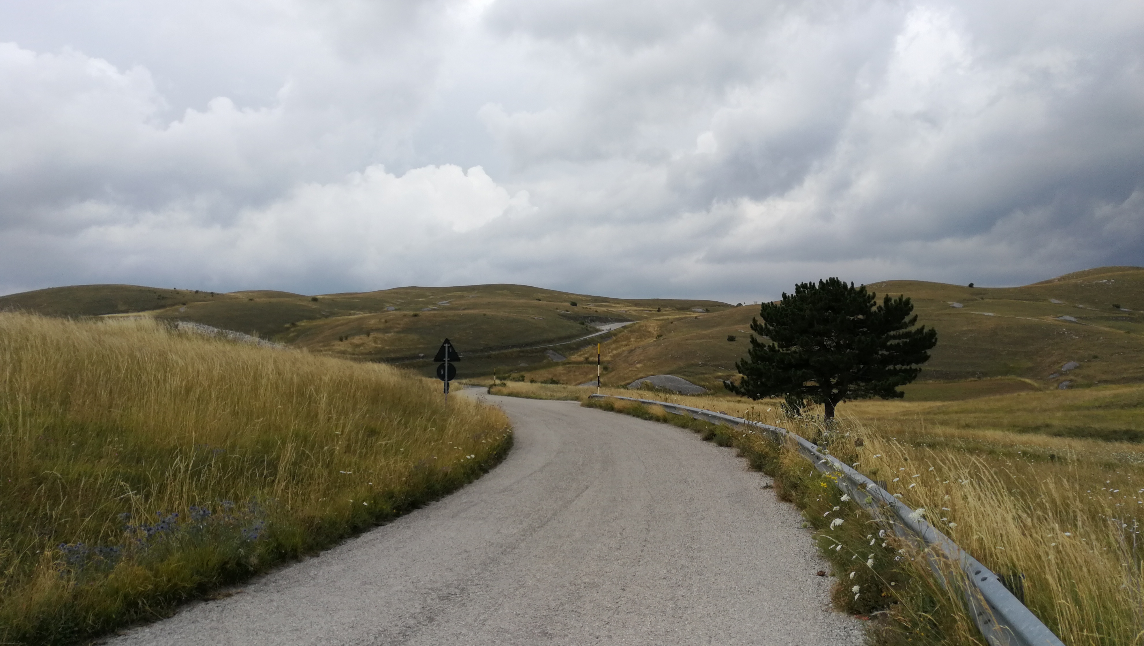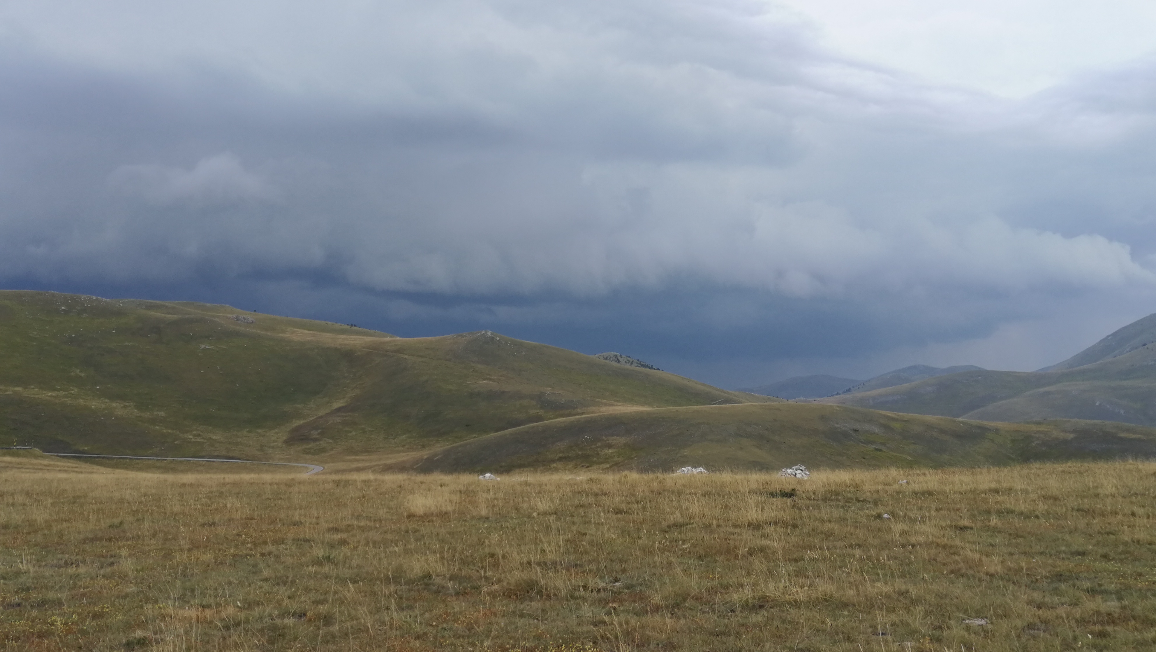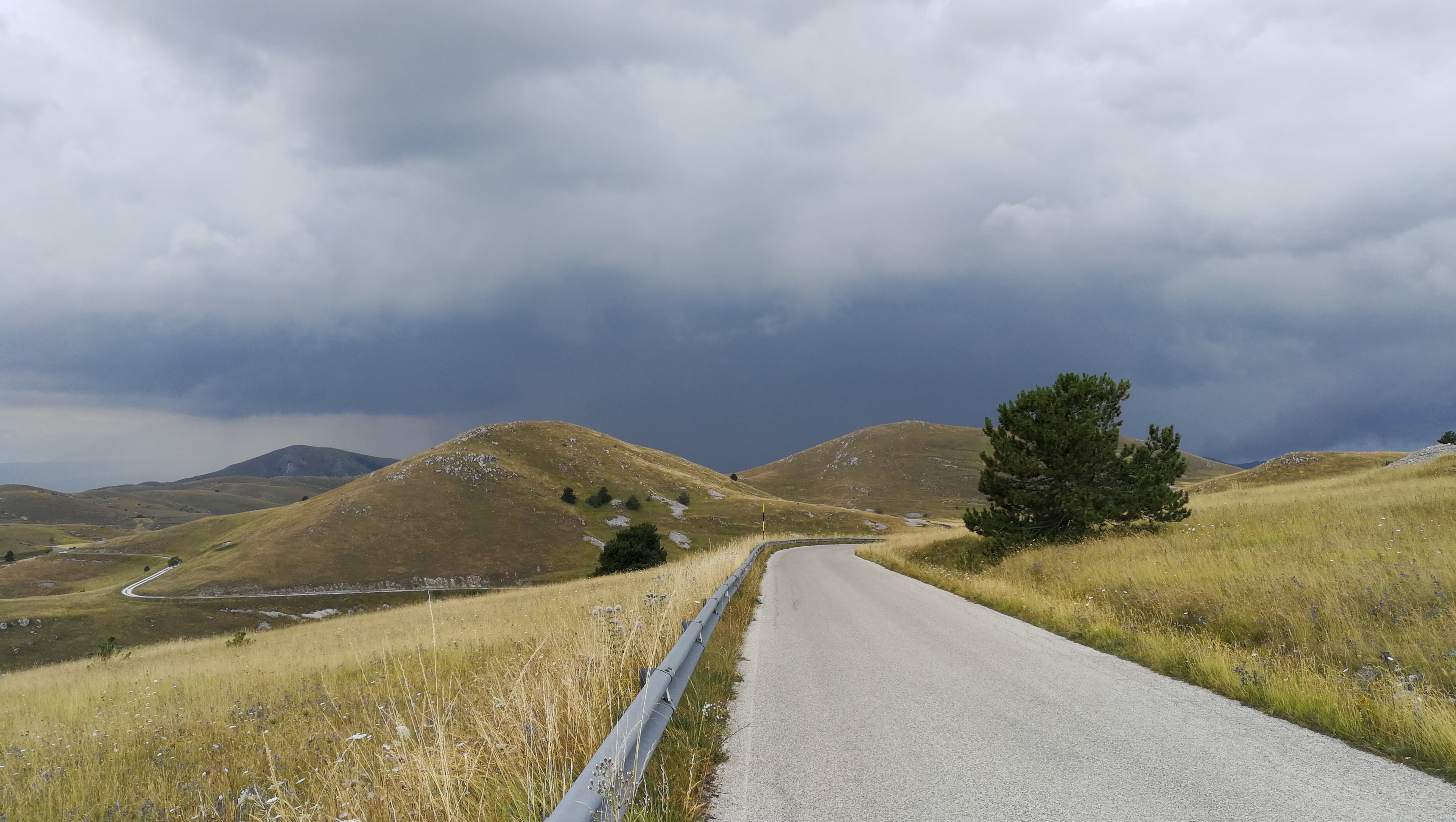 Nonostante i nuvoloni sparsi un po’ ovunque svolto a sud sulla 17 bis, su e giù ad Assergi e poi verso Campo Imperatore, tra i 1300 ed i 1600 m slm. Costeggiare il massiccio lungo questa bella strada è sempre bellissimo. In vista della piana sottostante Campo Imperatore, il piccolo Tibet, i goccioloni cominciano a cadere insistenti e devo fermarmi ad indossare la protezione antipioggia a corredo del giubbino estivo traforato. Servirà a poco perché mi sono accorto dopo la guaina interna si è tutta screpolata e corrosa, da buttare!