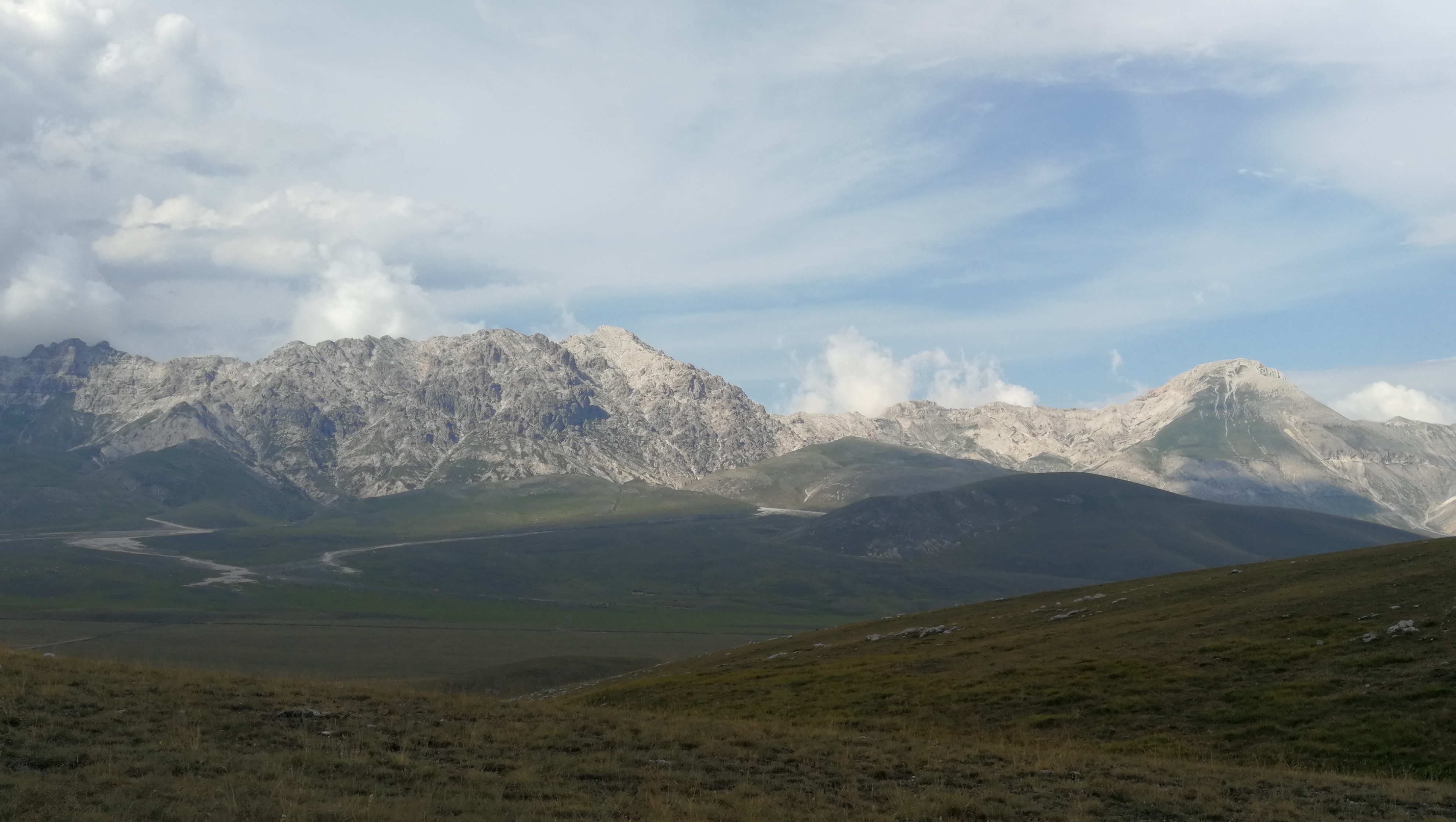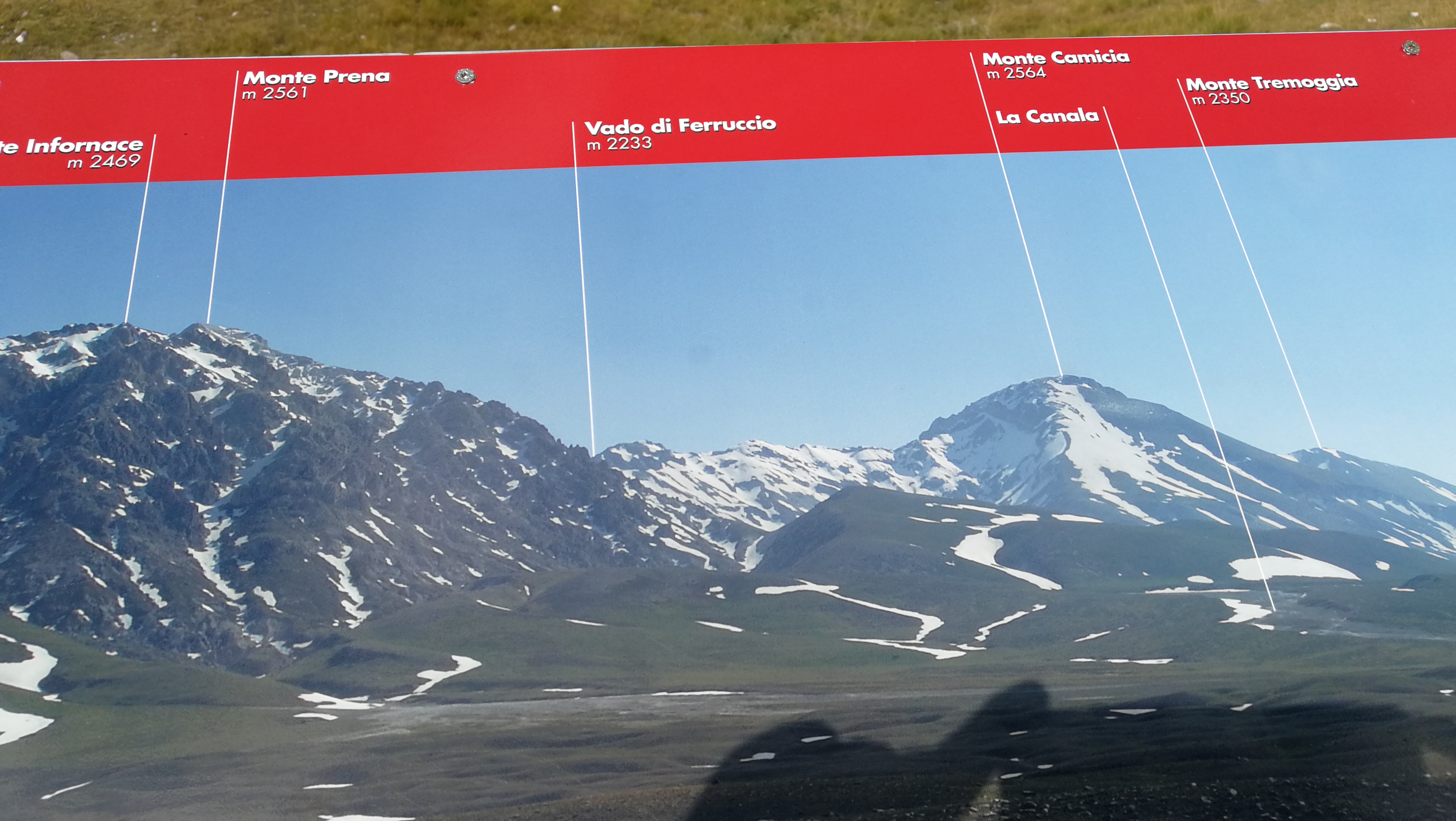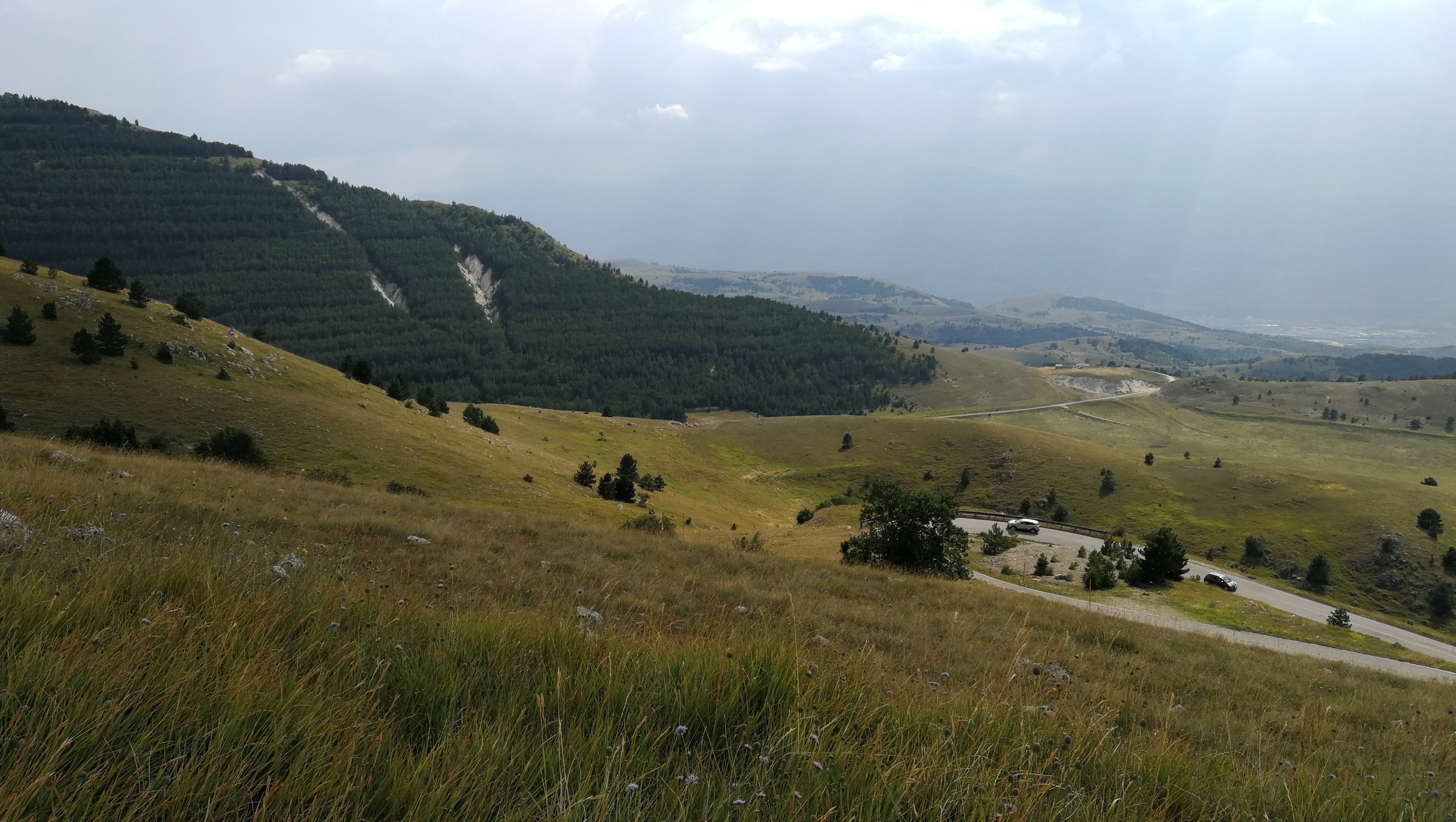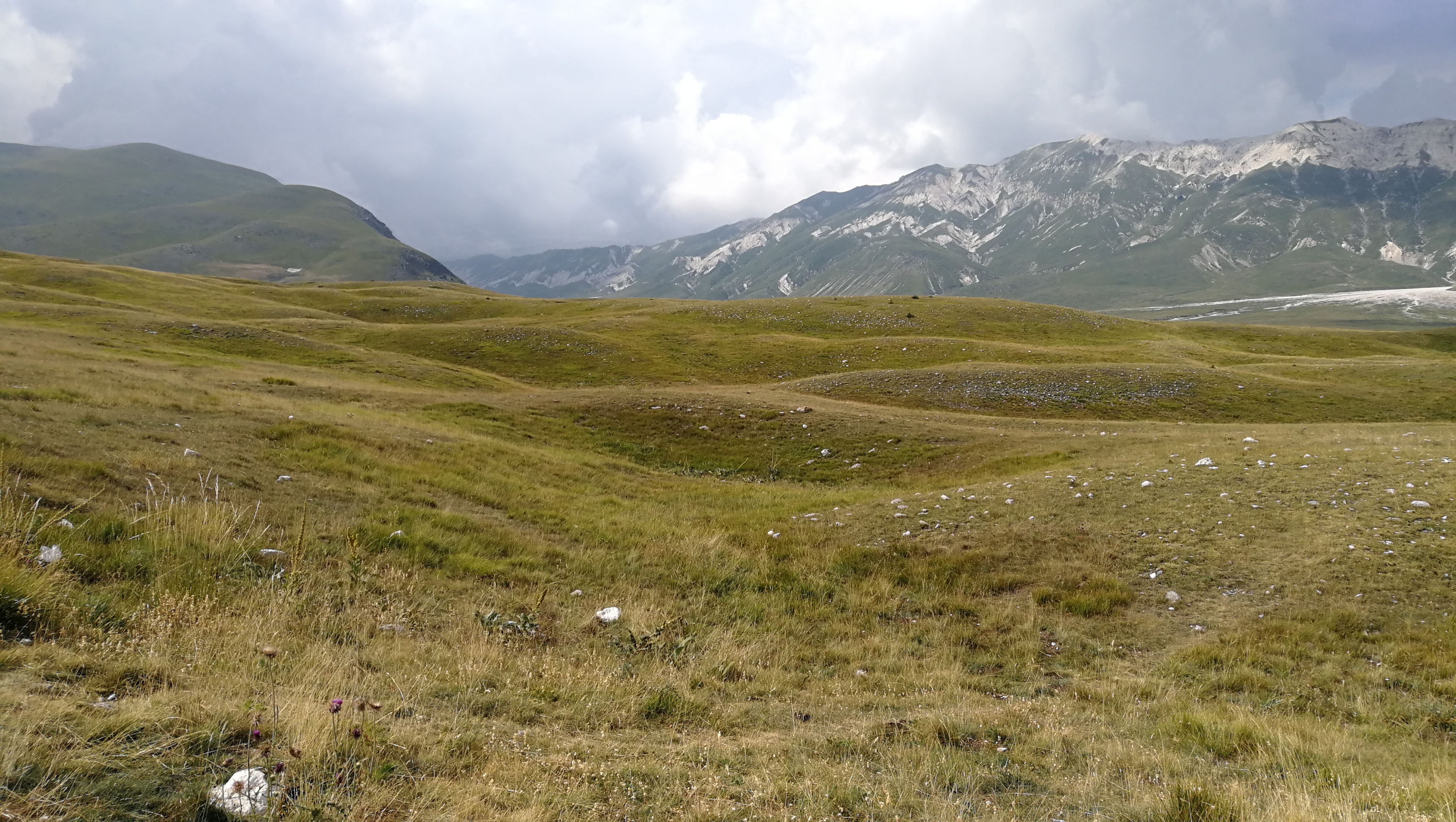 Nonostante i nuvoloni sparsi un po’ ovunque svolto a sud sulla 17 bis, su e giù ad Assergi e poi verso Campo Imperatore, tra i 1300 ed i 1600 m slm. Costeggiare il massiccio lungo questa bella strada è sempre bellissimo. In vista della piana sottostante Campo Imperatore, il piccolo Tibet, i goccioloni cominciano a cadere insistenti e devo fermarmi ad indossare la protezione antipioggia a corredo del giubbino estivo traforato. Servirà a poco perché mi sono accorto dopo la guaina interna si è tutta screpolata e corrosa, da buttare!