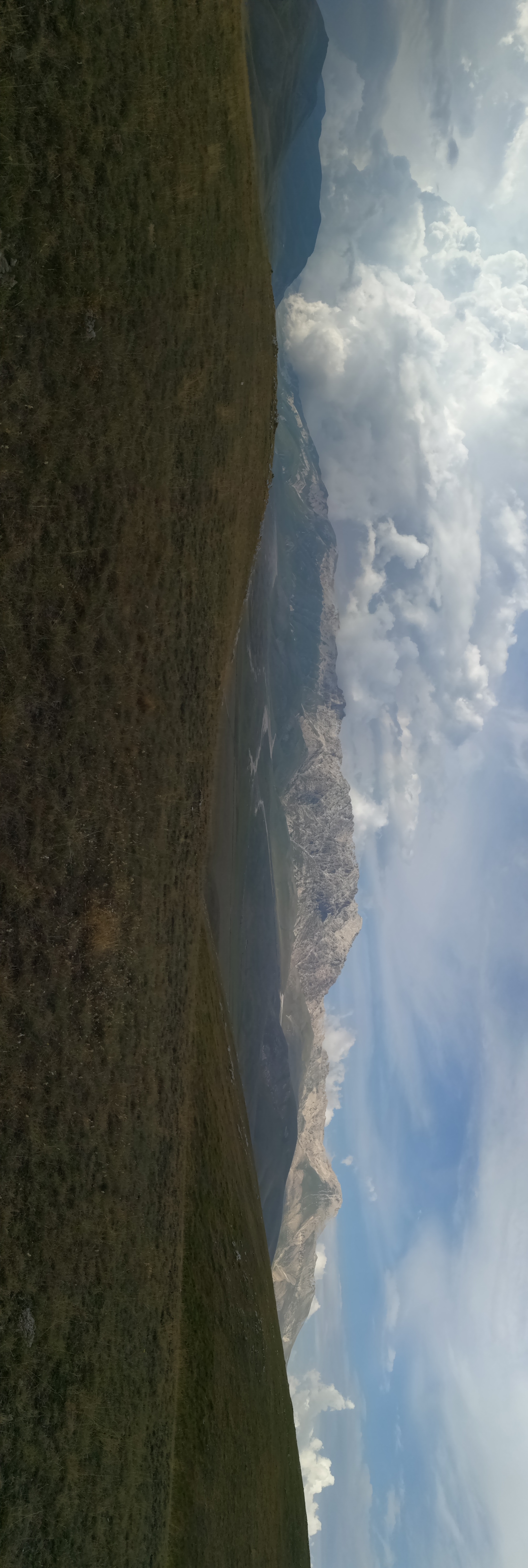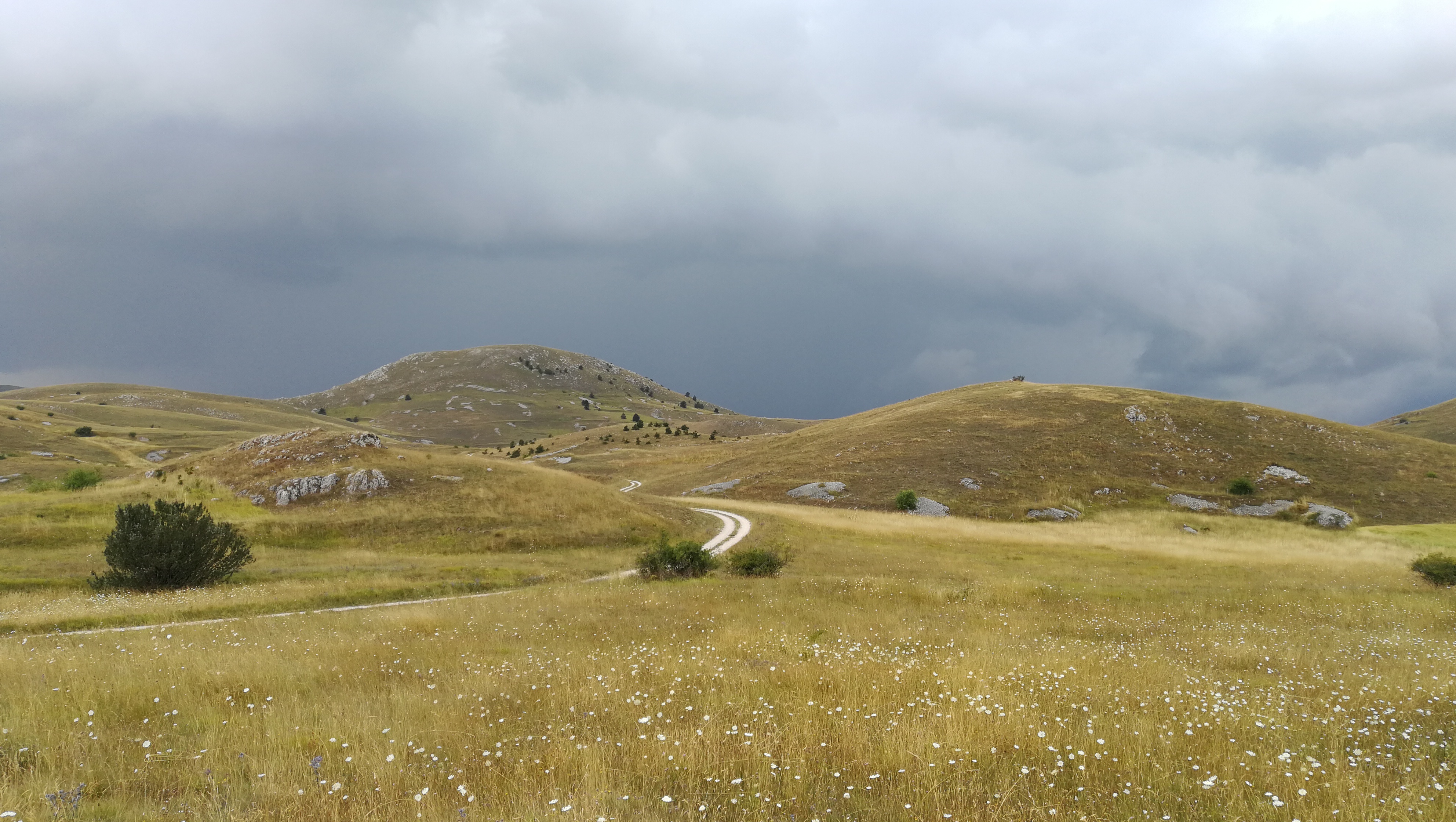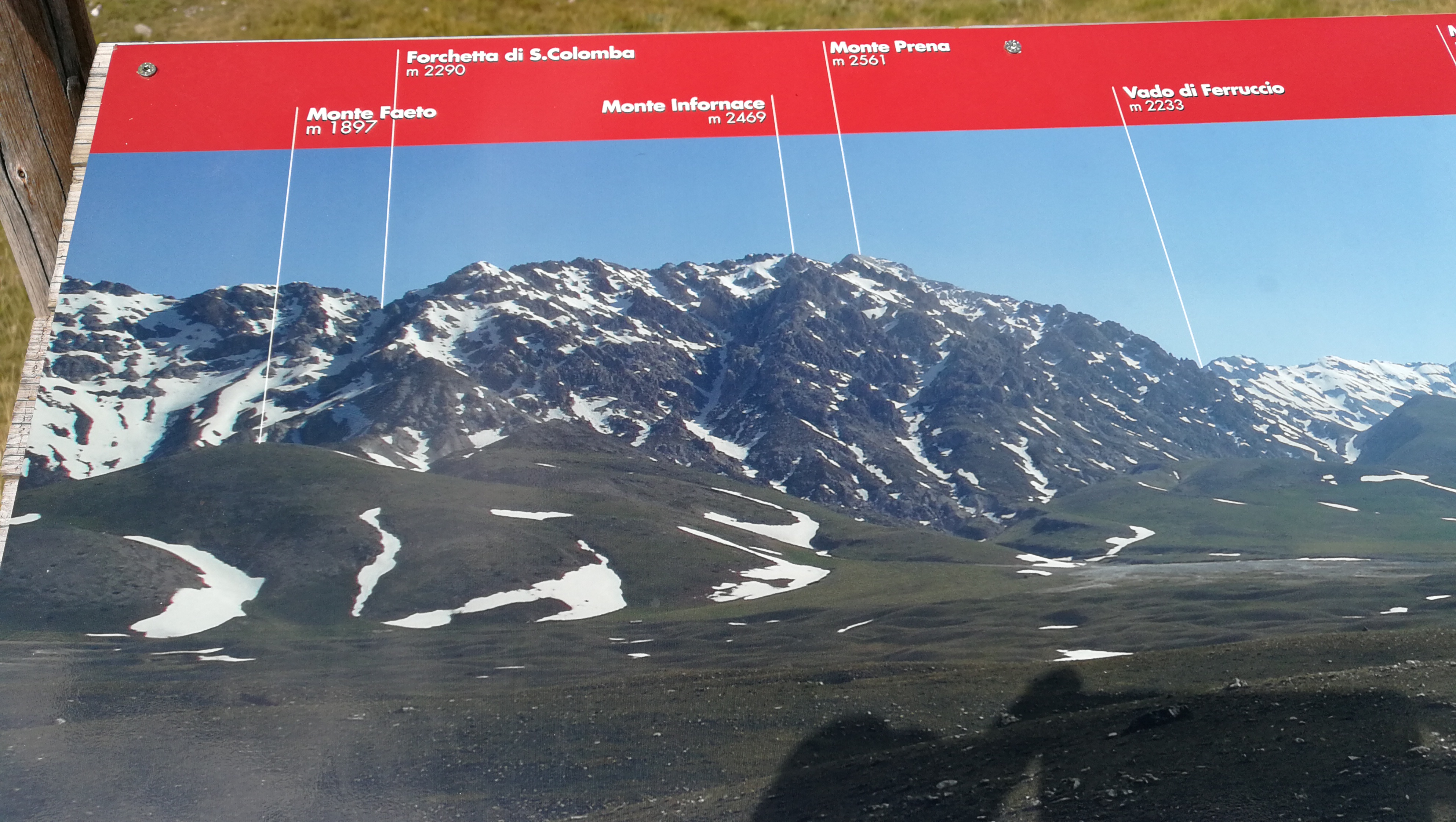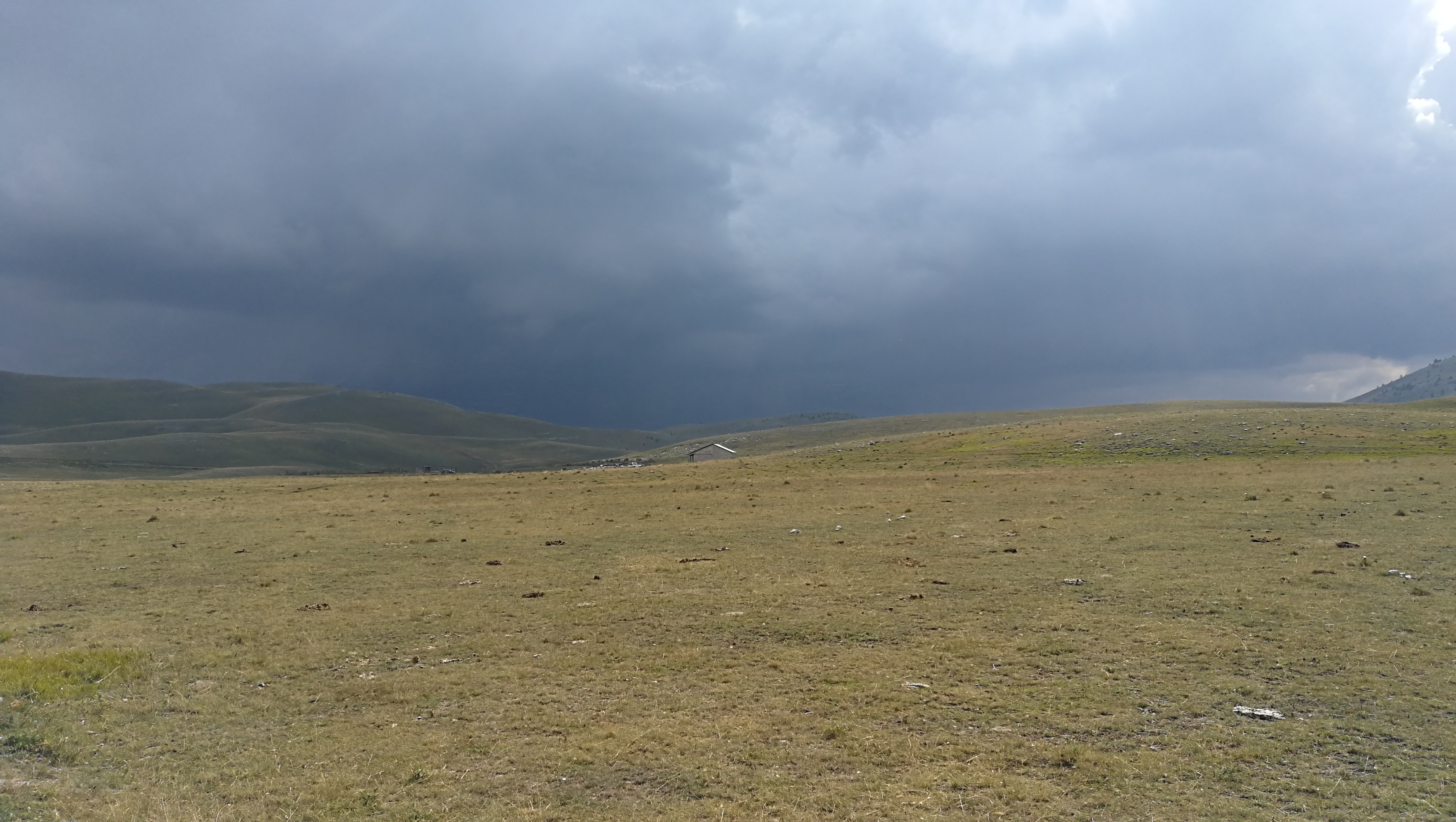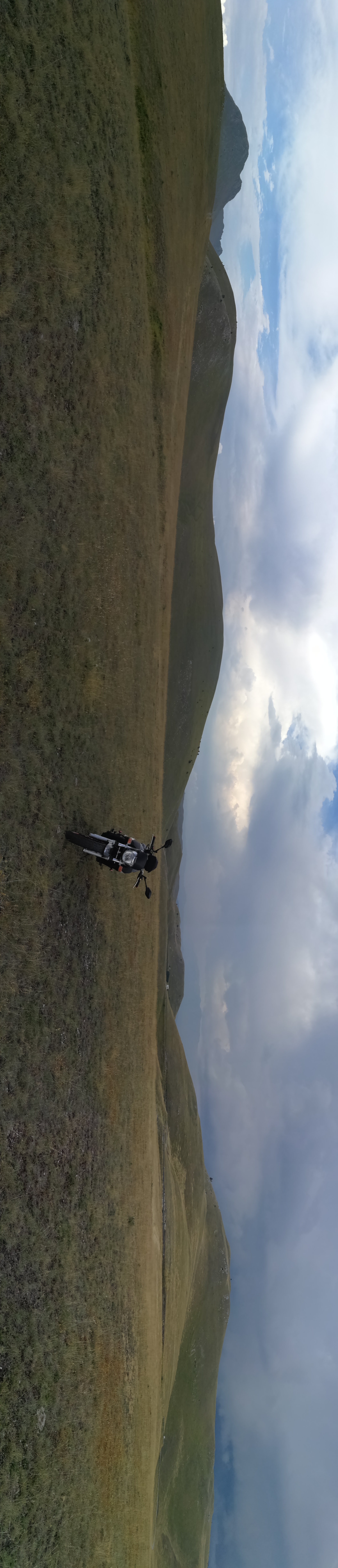 Nonostante i nuvoloni sparsi un po’ ovunque svolto a sud sulla 17 bis, su e giù ad Assergi e poi verso Campo Imperatore, tra i 1300 ed i 1600 m slm. Costeggiare il massiccio lungo questa bella strada è sempre bellissimo. In vista della piana sottostante Campo Imperatore, il piccolo Tibet, i goccioloni cominciano a cadere insistenti e devo fermarmi ad indossare la protezione antipioggia a corredo del giubbino estivo traforato. Servirà a poco perché mi sono accorto dopo la guaina interna si è tutta screpolata e corrosa, da buttare!