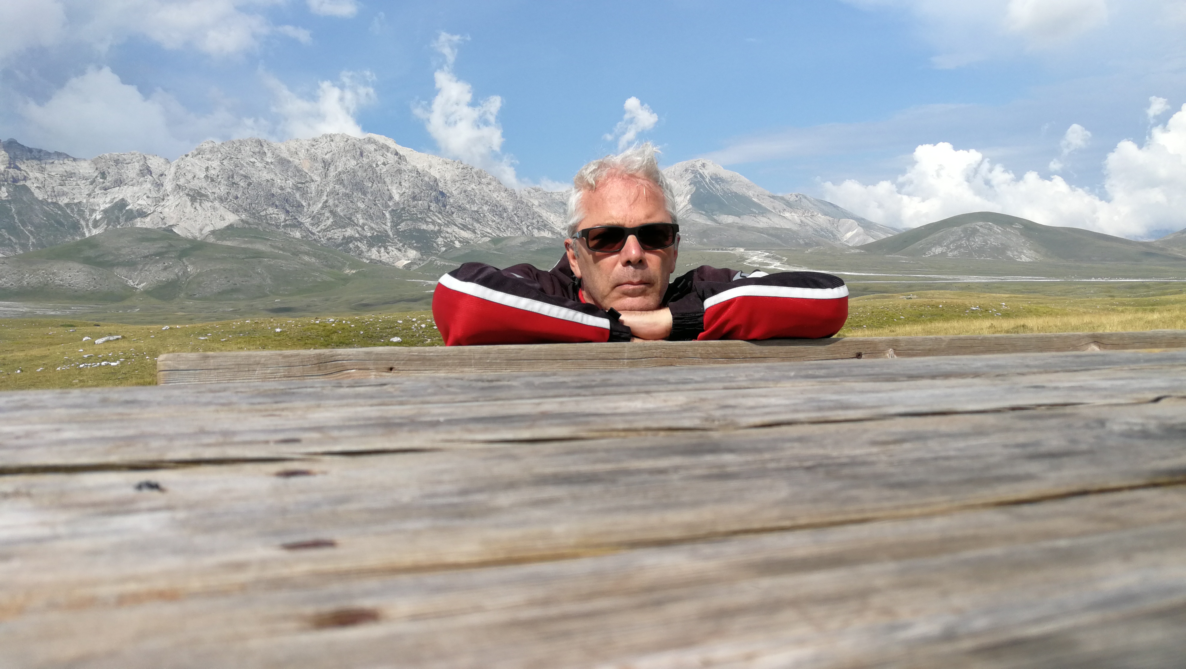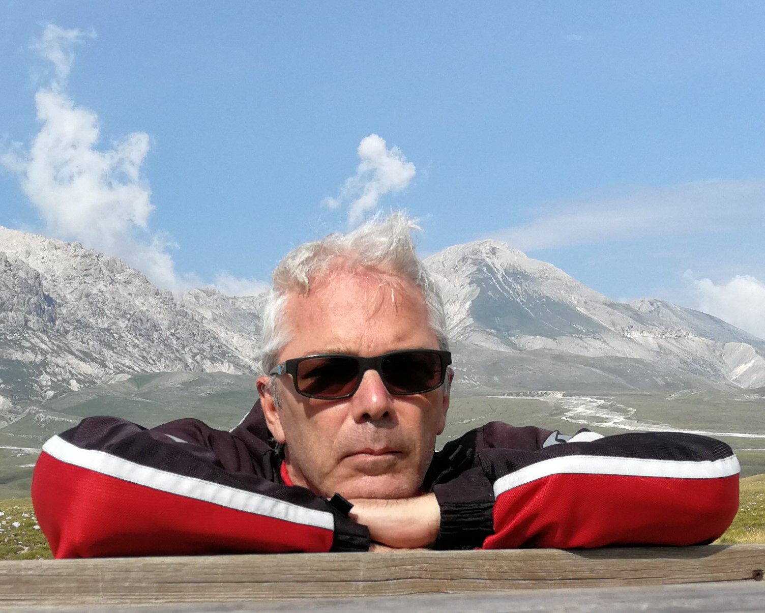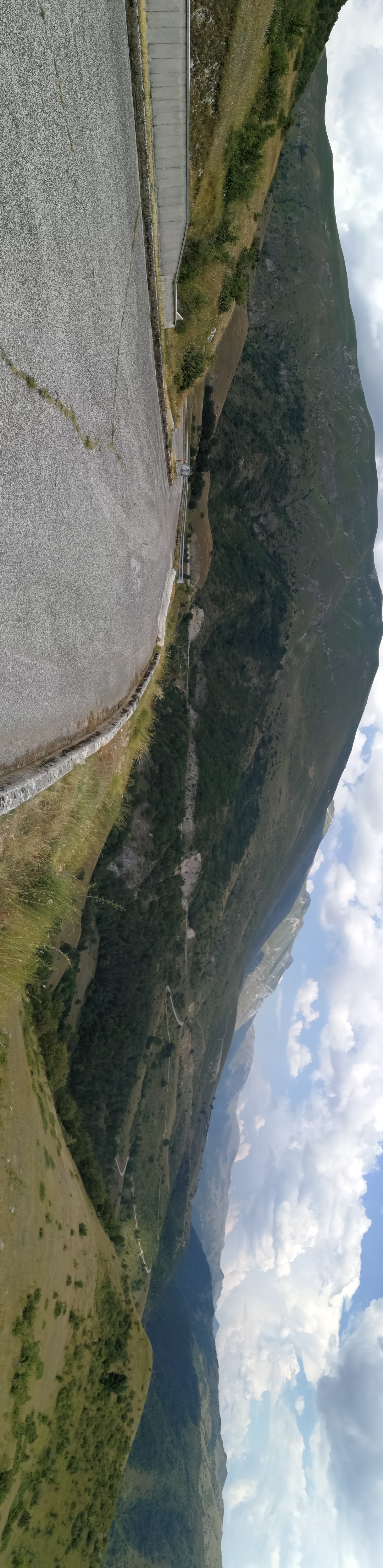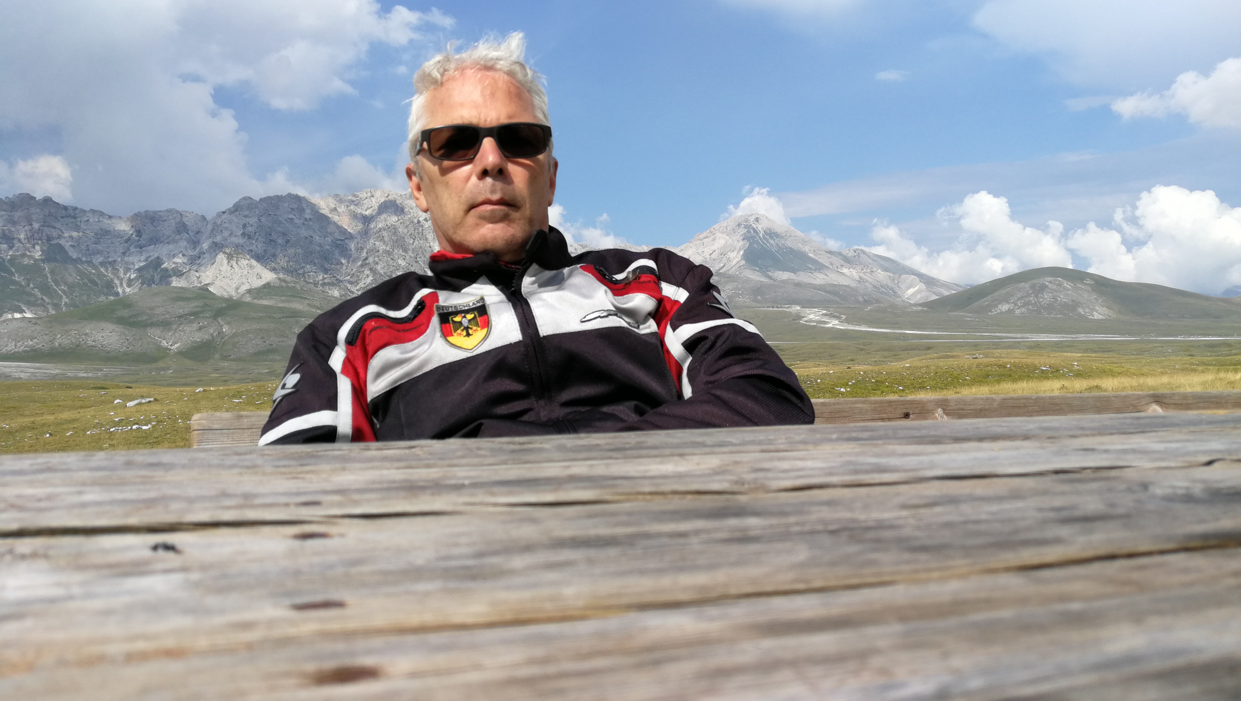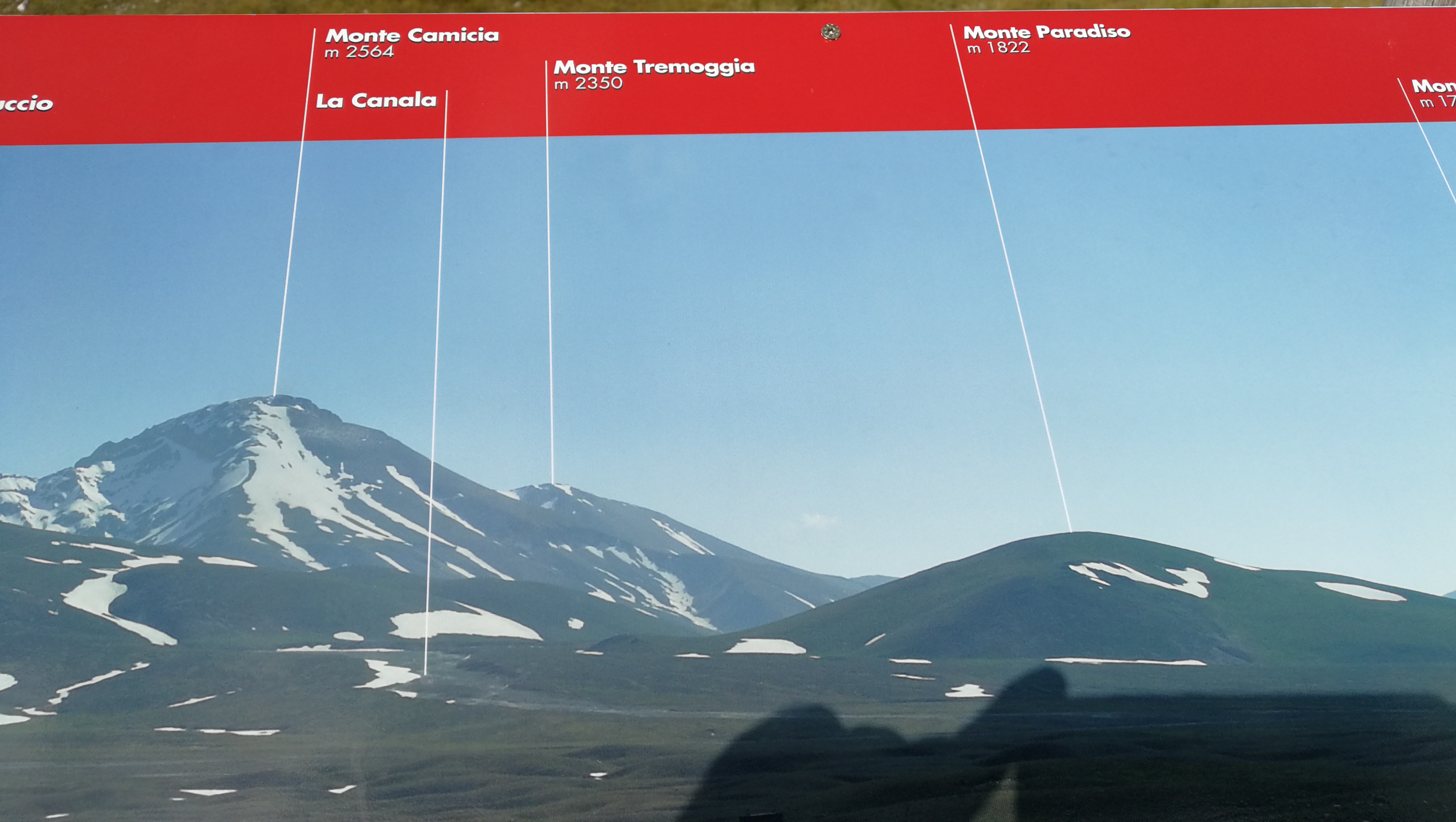 Nonostante i nuvoloni sparsi un po’ ovunque svolto a sud sulla 17 bis, su e giù ad Assergi e poi verso Campo Imperatore, tra i 1300 ed i 1600 m slm. Costeggiare il massiccio lungo questa bella strada è sempre bellissimo. In vista della piana sottostante Campo Imperatore, il piccolo Tibet, i goccioloni cominciano a cadere insistenti e devo fermarmi ad indossare la protezione antipioggia a corredo del giubbino estivo traforato. Servirà a poco perché mi sono accorto dopo la guaina interna si è tutta screpolata e corrosa, da buttare!