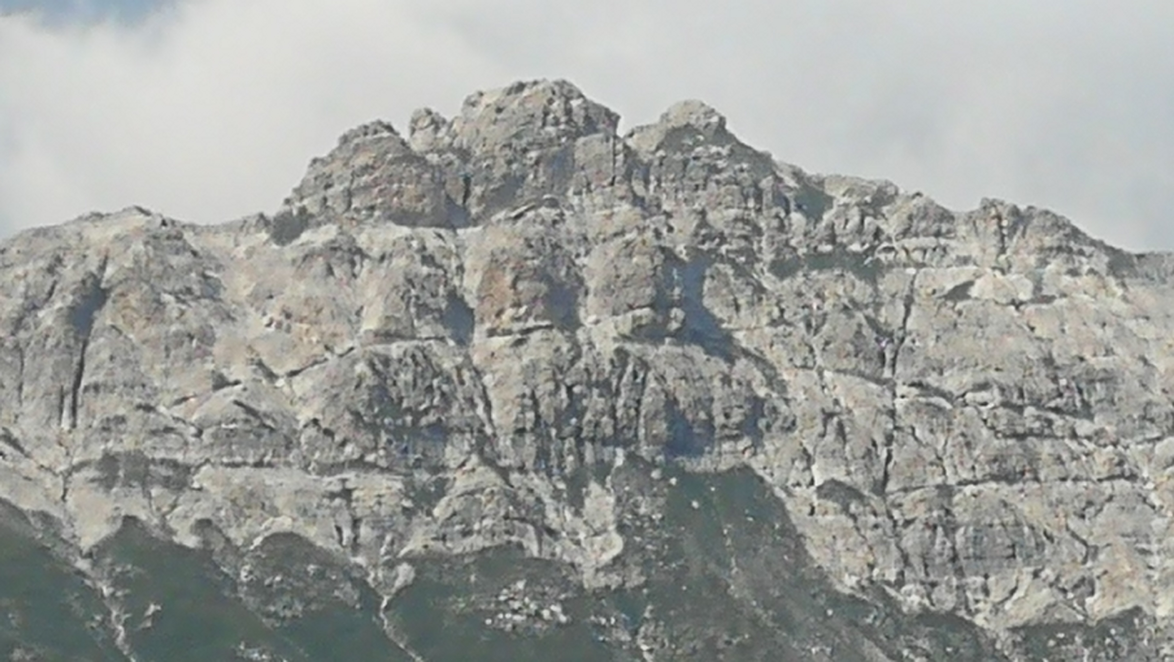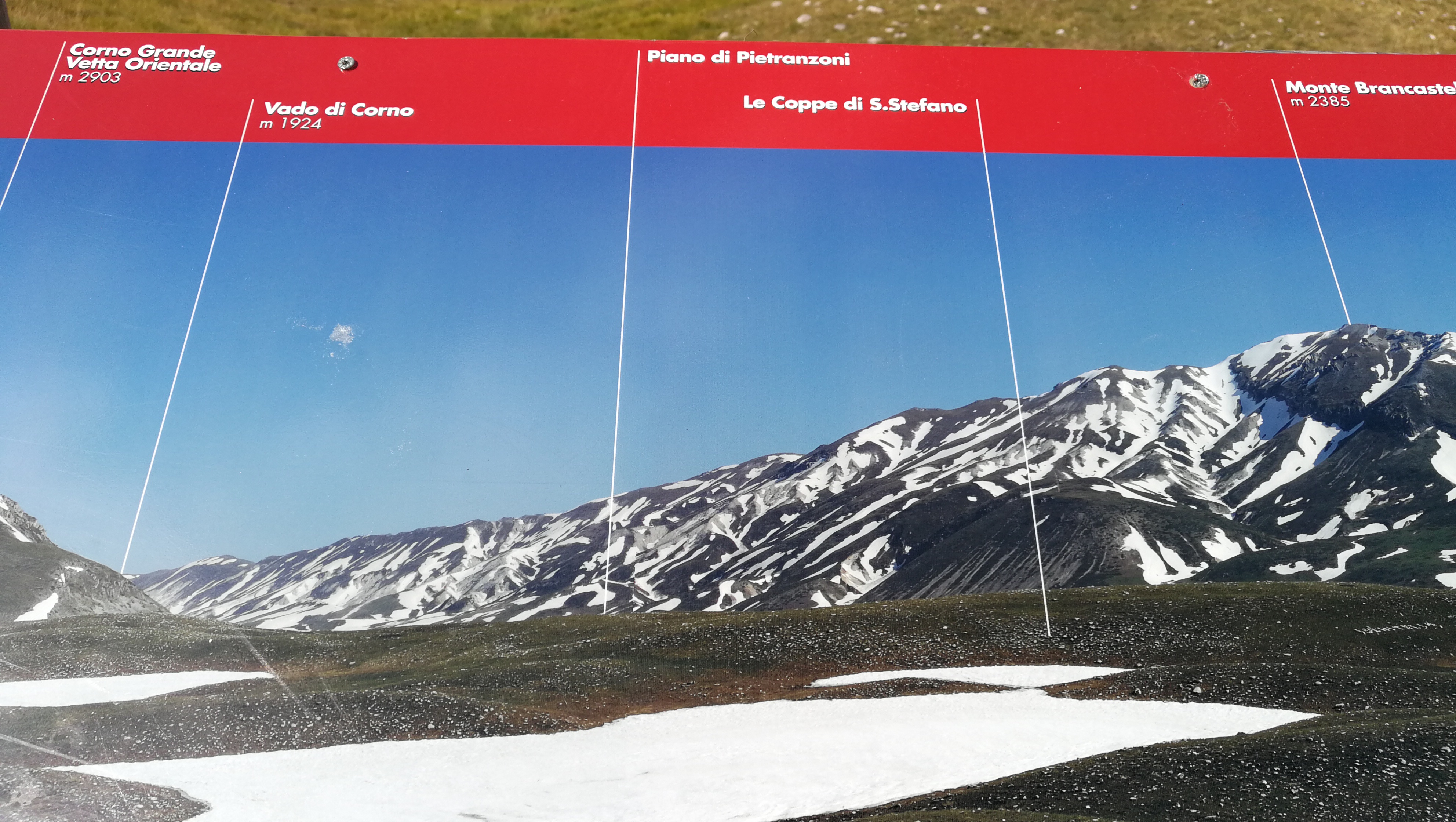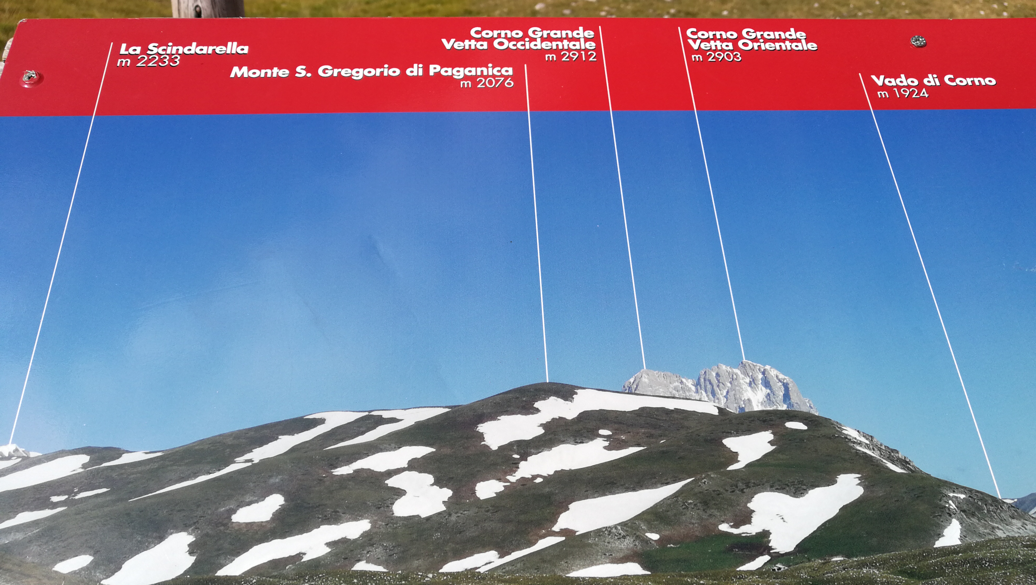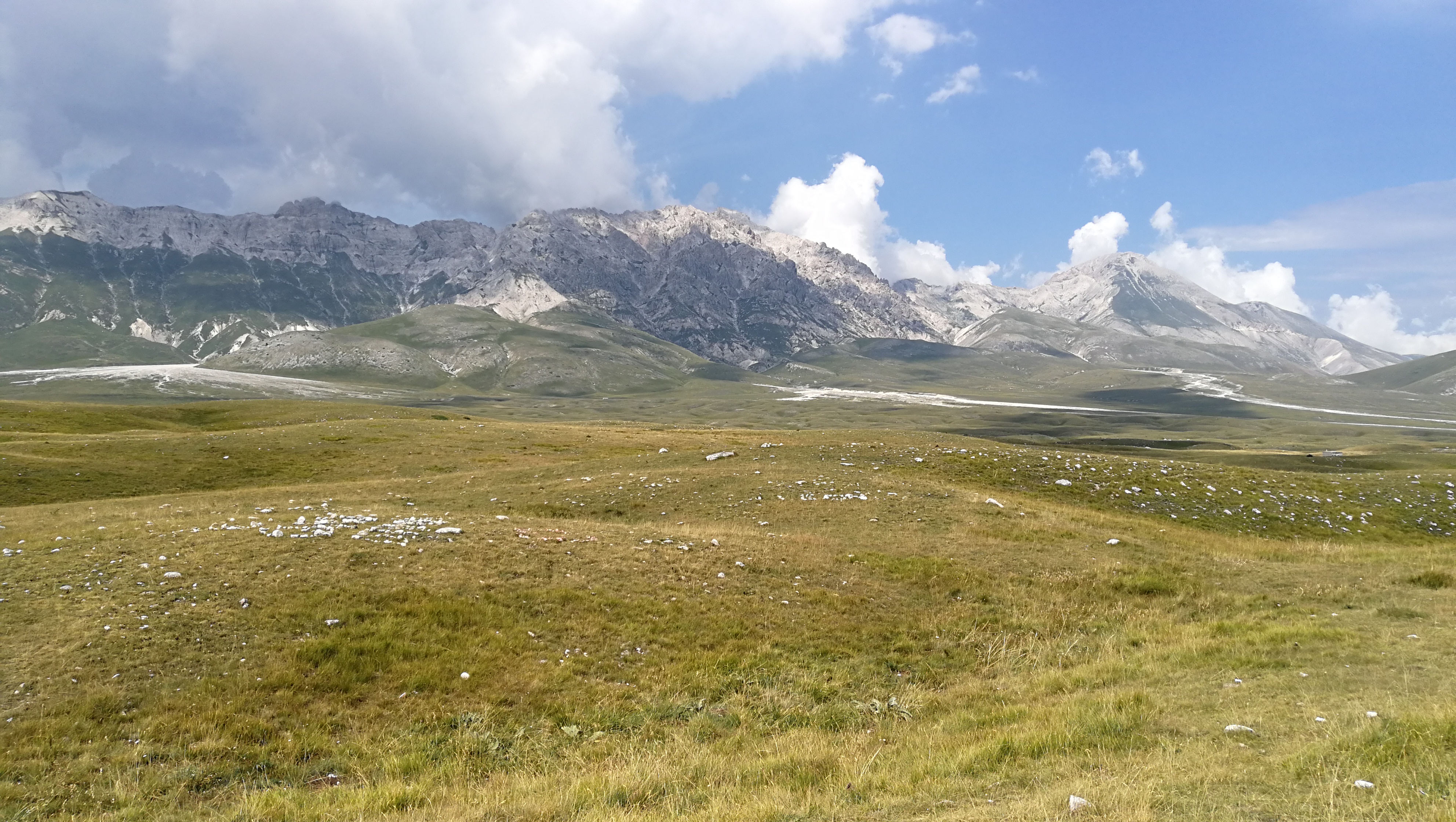 Mi fermo a godere degli sprazzi di sole e il panorama della cinta di cime davanti a me, solo il Corno Grande è coperto da nuvoloni scuri. A ovest, verso la strada di ritorno, si addensano nubi scure: nulla di buono in vista.