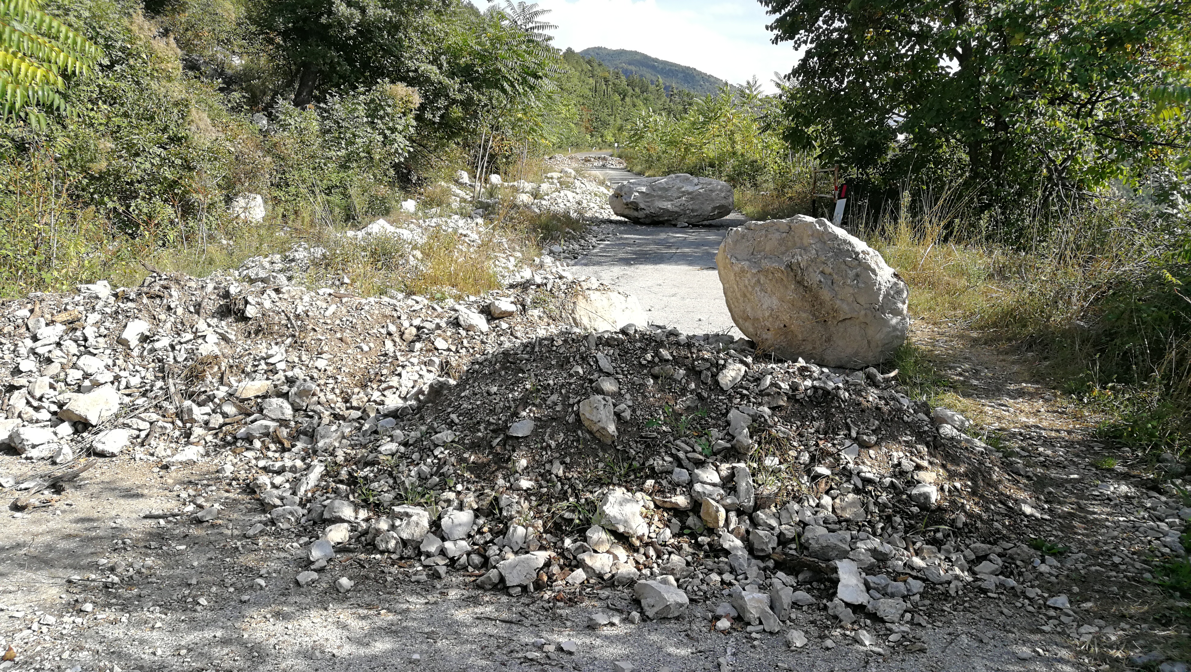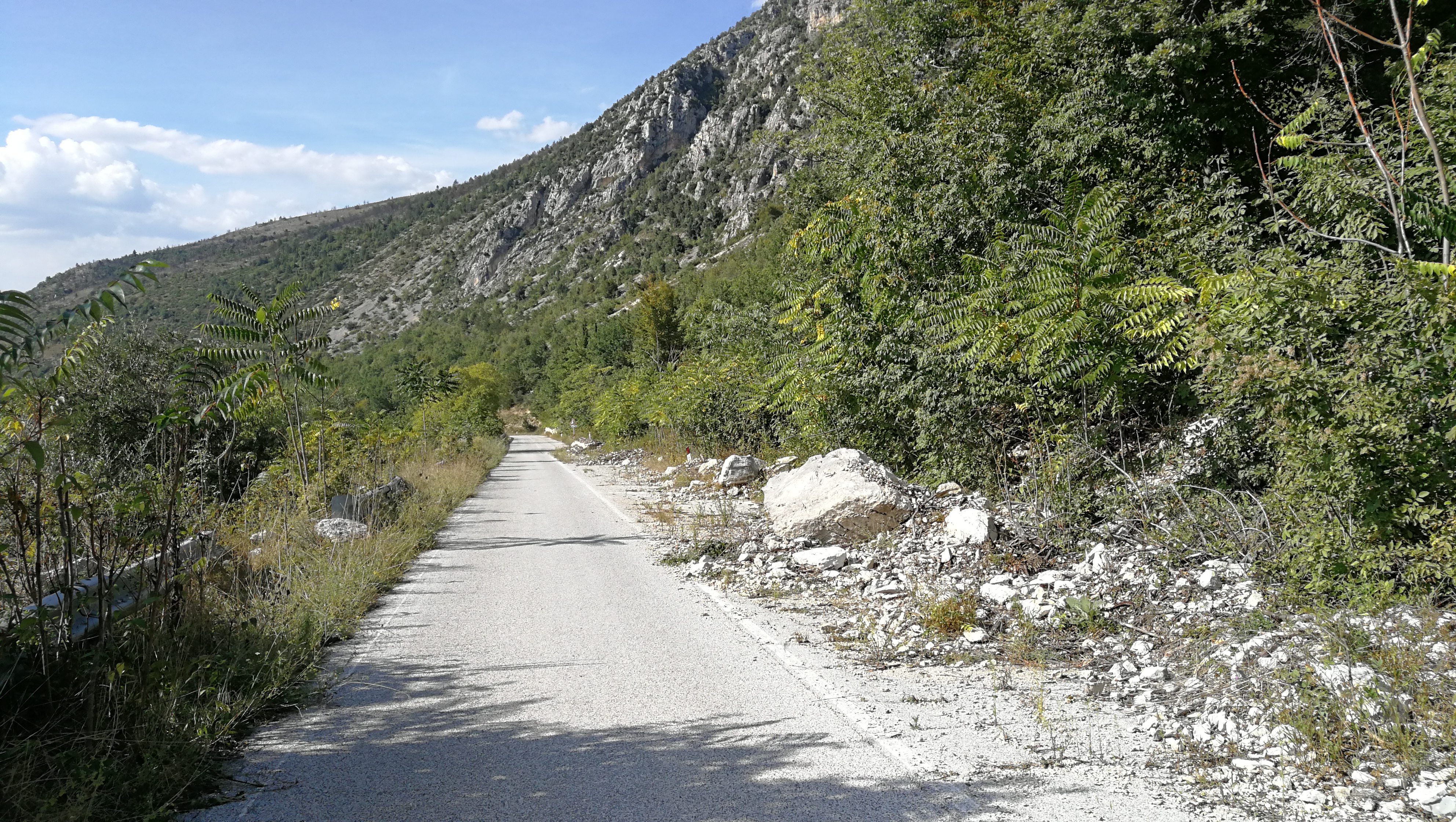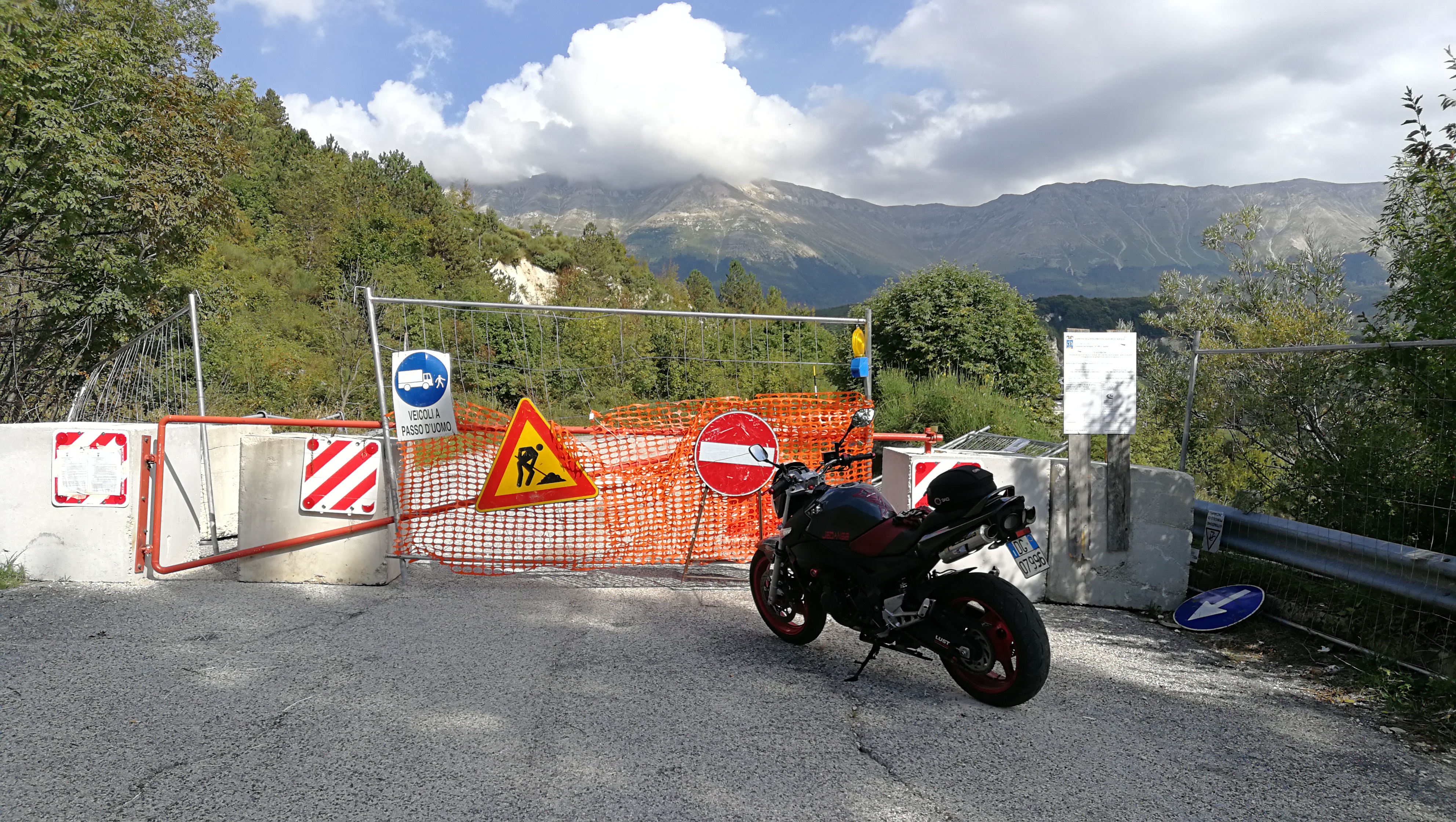 A dir la verità un primo blocco importante l’avevo già trovato prima di arrivare a Pacentro, per una volta che venendo da Pratola Peligna ho imboccato la strada più breve mi sono ritrovato il cartello che avvisava del blocco ma l’ho ignorato pensando ai soliti blocchi di cemento: superato il primo passando nel mezzo pensavo fosse fatta ma tre tornanti e due km più su c’era da tornare indietro. I resti di una frana erano stati sparsi a formare delle barriere, un grosso masso ed un altro mucchio di sassi e terra. Ma visto che a forza di passarci intorno pedoni e ciclisti hanno creato dei sentierini mi sono arrischiato con la moto in precario equilibrio ma sono passato arrivando in paese, al ritorno stessa strada ma con moto condotta a mano sul primo tratto!