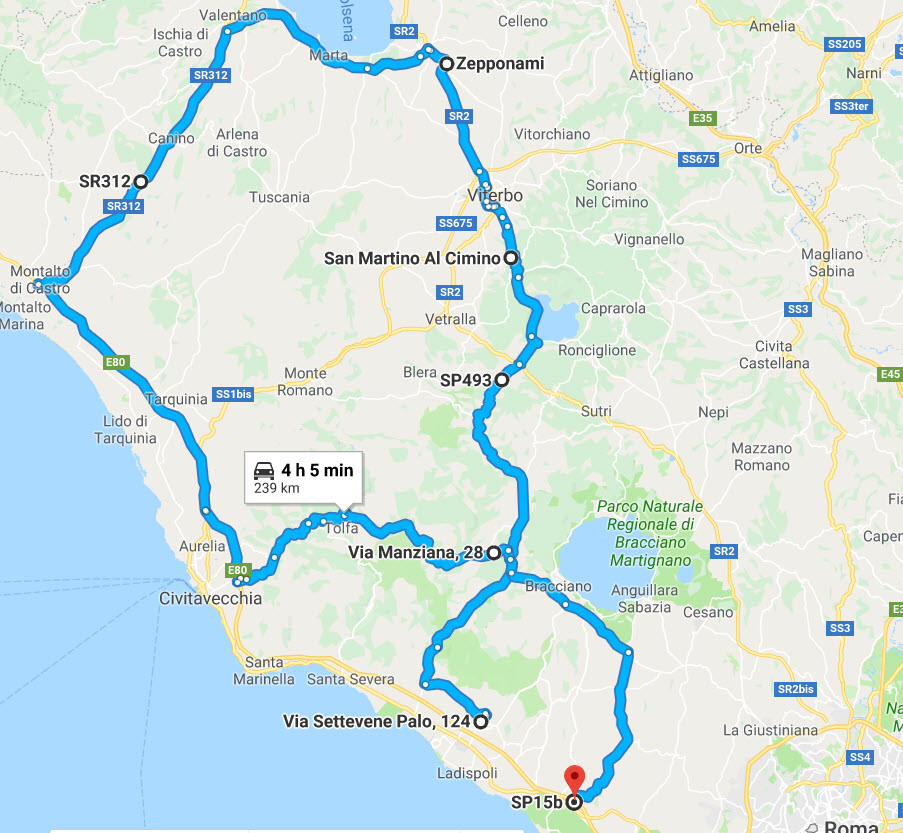 Da Cerveteri passando da Sasso fino a raggiungere la Braccianese e da qui fino ad Oriolo Romano, per poi arrivare ad incrociare la Cassia proprio all’altezza del bivio che sale al Lago di Vico. Passando da San Martino al Cimino attraverso i bei boschi; dopo Viterbo ancora un pezzetto di Cassia fino a Montefiascone. In cerca di sole verso il Tirreno a ovest per Canino e poi Montalto di Castro: un po’ di benzina per la moto…e per me!
